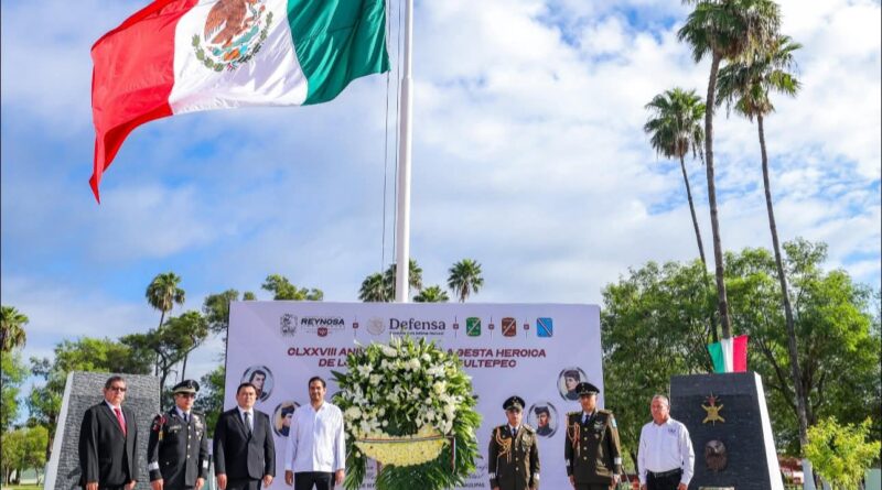 El Presidente Municipal de Reynosa, Carlos Peña Ortiz, participó junto al Comandante de la Octava Zona Militar, General de Brigada DEM Guillermo Arellano Morales, en la Ceremonia del CLXXVIII Aniversario de la Batalla del Castillo de Chapultepec, llevada a cabo este sábado 13 de septiembre.