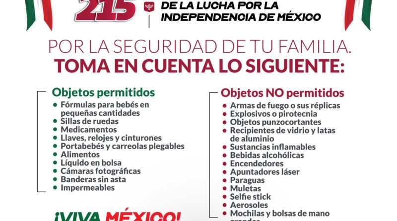 La Coordinación de Protección Civil del Gobierno de Reynosa da a conocer la lista de artículos que podrás ingresar durante la celebración del 215 Aniversario del Inicio de la Lucha por la Independencia de México en la plaza Miguel Hidalgo; evita llevar artículos NO permitidos.