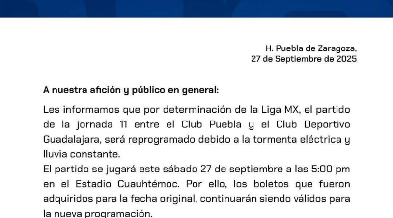 El partido entre Puebla y Chivas se jugará a las 21:00 horas (tiempo del centro de México) en el Estadio Cuauhtémoc.