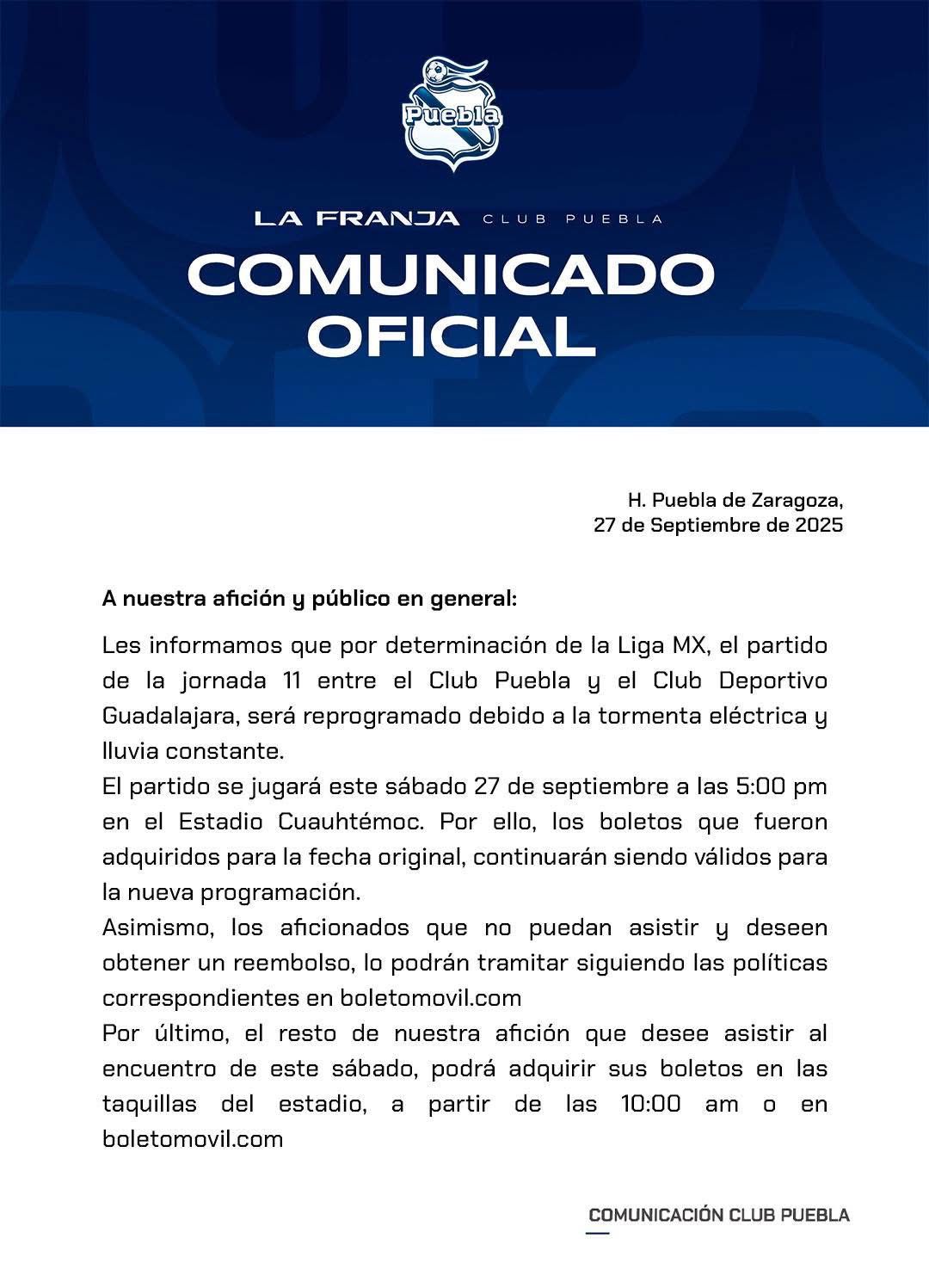 Inicialmente, el encuentro estaba programado para el viernes 26 de septiembre, pero debido a una tormenta eléctrica que afectó el estadio, se tomó la decisión de reprogramarlo para el sábado 27 de septiembre a las 17:00 horas, y finalmente se confirmó que arrancará a las 21:00 horas.