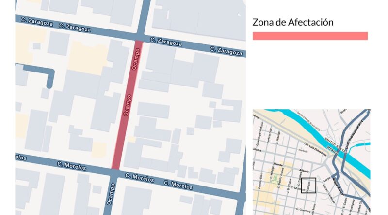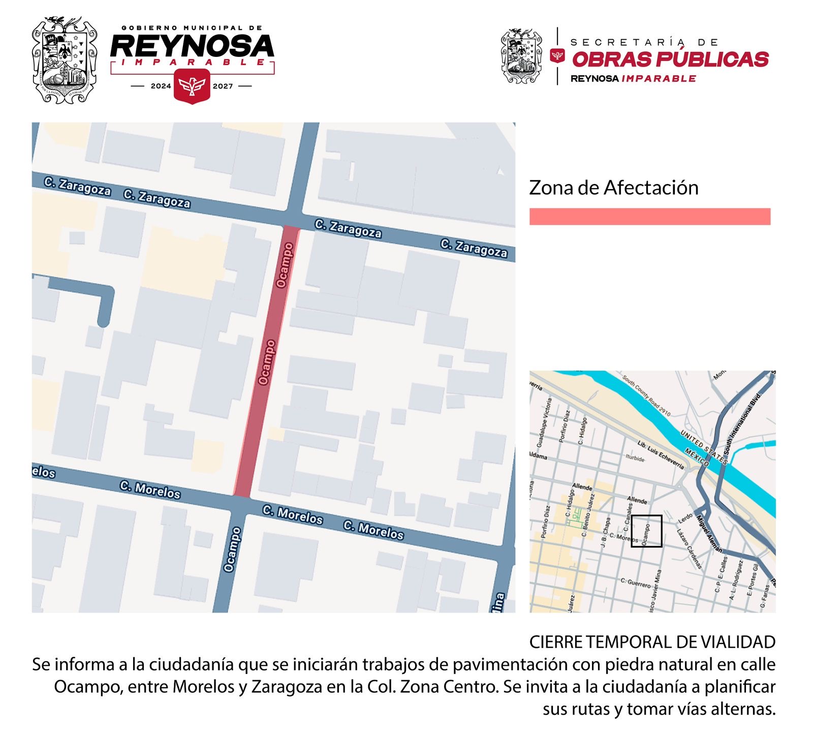 Se informa a la ciudadanía que la calle Ocampo, entre Morelos y Zaragoza en la Zona Centro, permanecerá cerrada temporalmente debido al inicio de trabajo de recubrimiento con piedra natural.
