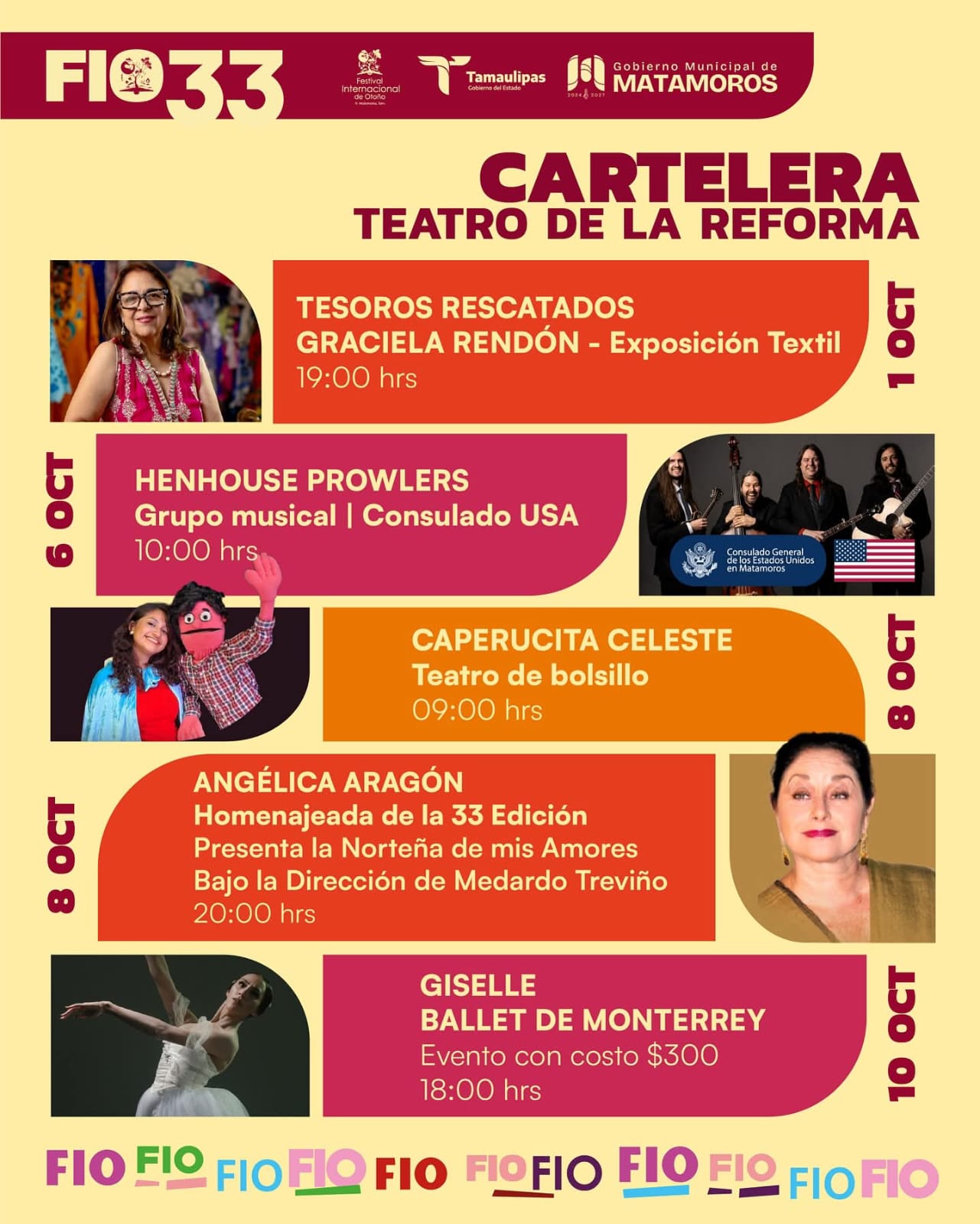 H. Matamoros, Tamaulipas.- El gobierno de Beto Granados invita a la comunidad matamorense a disfrutar de la variada cartelera del Festival Internacional de Otoño (FIO33), que tendrá como sede principal el histórico Teatro de la Reforma. Este espacio se llenará de arte, cultura y talento con eventos para todas las edades, reafirmando el compromiso de esta administración con el impulso a la vida cultural de la ciudad.