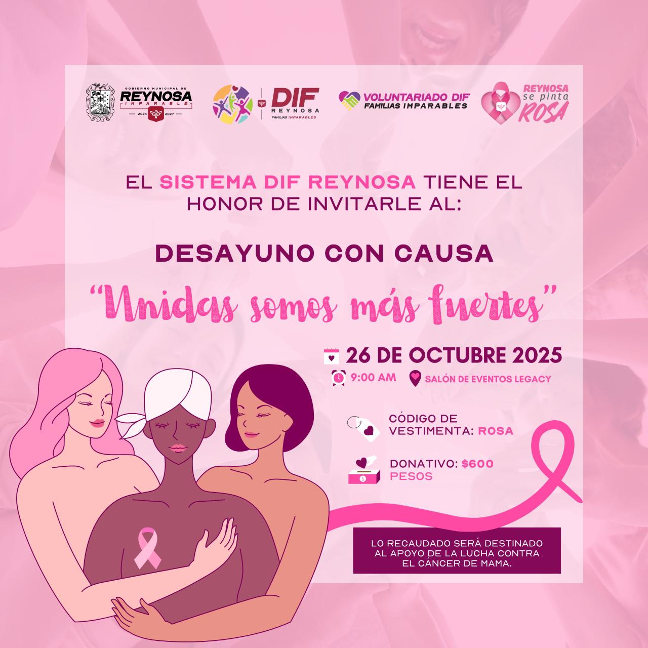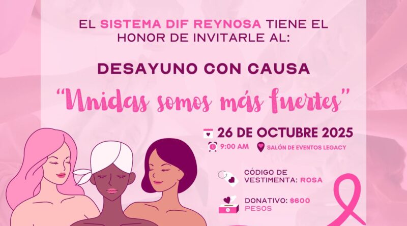 El Sistema DIF-Reynosa, que preside Carlos Luis Peña Garza y el Voluntariado que encabeza Alejandra Yelitza Garza, invita a la ciudadanía a sumarse al Desayuno con Causa “Unidas Somos Más Fuertes”, evento que se llevará a cabo el próximo 26 de octubre de 2025 a las 9:00 de la mañana en el Salón de Eventos Legacy.