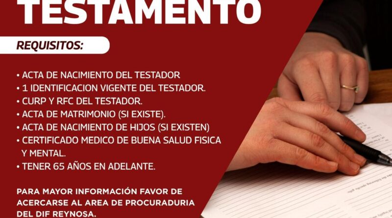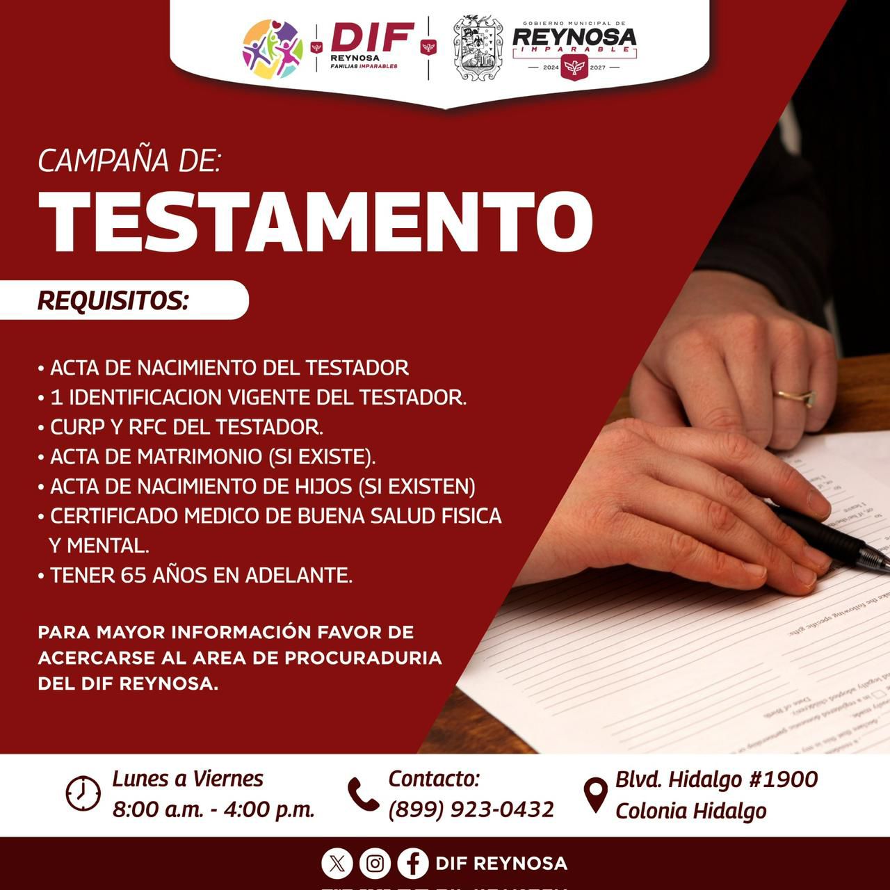 El Sistema DIF-Reynosa que preside Carlos Luis Peña Garza y el Voluntariado que encabeza Alejandra Yelitza Garza, invitan a la población de 65 años en adelante a participar en la Campaña de Testamento, una iniciativa que busca promover la cultura de la previsión y fortalecer la seguridad jurídica de las familias.