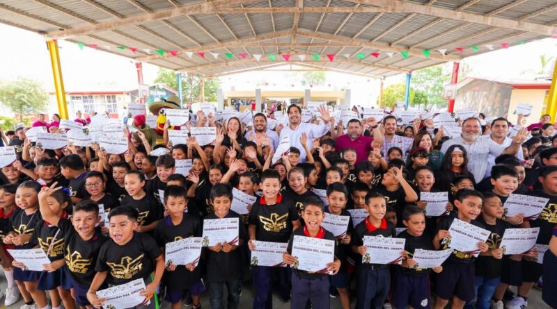 «El día de hoy ya son Guardianes del Orden, aprendieron a cuidar el medio ambiente, no tirar basura; todo eso es importante para nuestra ciudad, debemos evitar que haya quien tire basura en lugares clandestinos porque debe ir en el basurero o el contenedor, gracias por ayudar», dijo el Alcalde a la emocionada comunidad escolar de la Primaria Moctezuma.