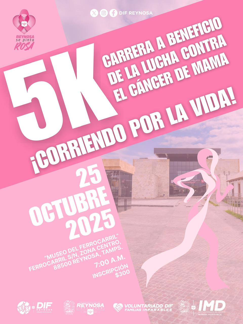 El Sistema DIF-Reynosa que preside Carlos Luis Peña Garza, invita a todas las familias, deportistas y ciudadanía en general a participar en la Carrera 5K “Corriendo por la Vida”, un evento con causa que busca generar conciencia y apoyar a las mujeres que enfrentan la lucha contra el cáncer de mama, como parte del Mes Rosa 2025, que impulsa acciones de prevención, esperanza y unión comunitaria.