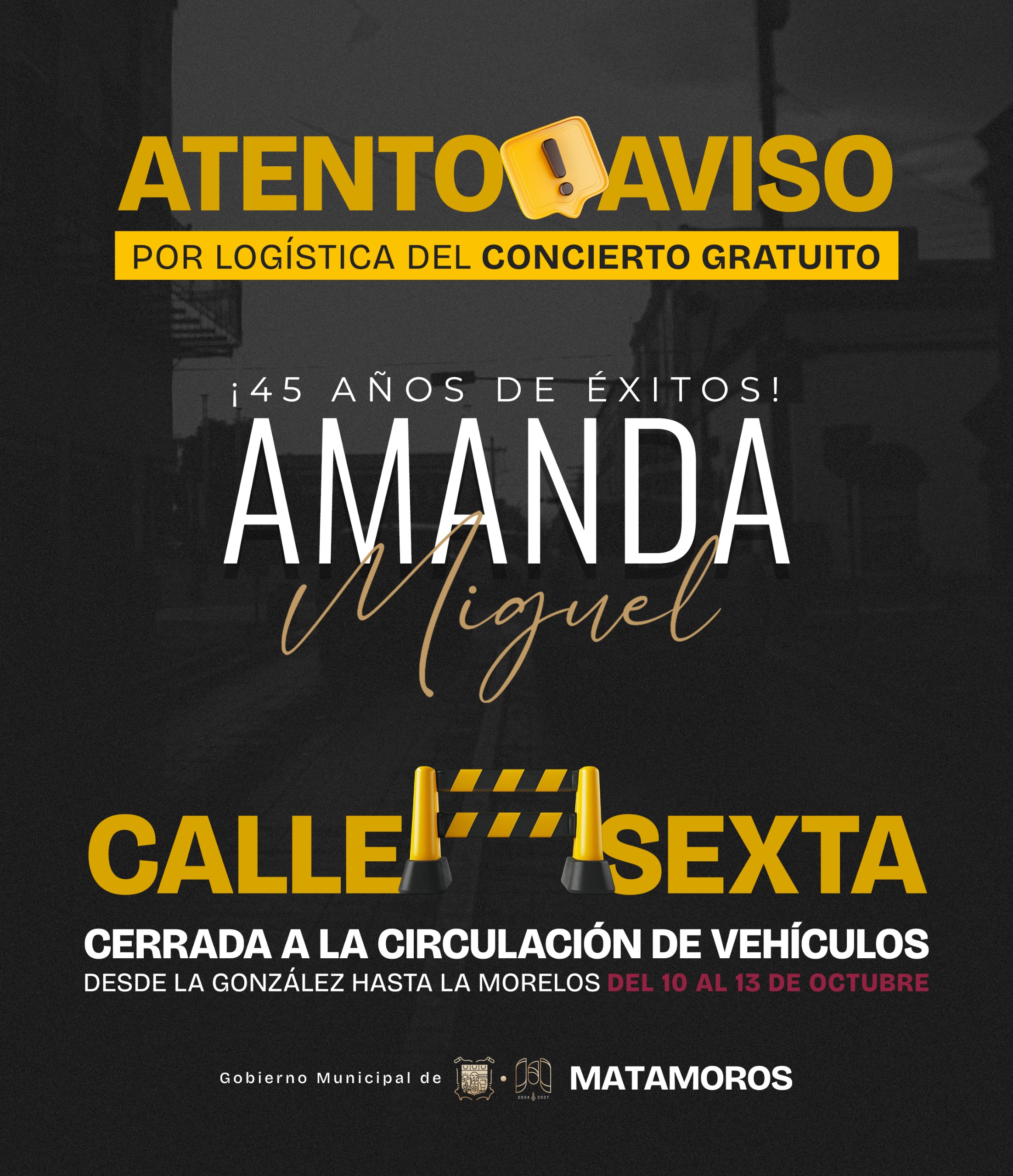H. Matamoros, Tamaulipas.– Con motivo del gran cierre del Festival Internacional de Otoño y del Festival Internacional en la Costa del Seno Mexicano, el Gobierno Municipal de Matamoros informa a la ciudadanía que la calle Sexta permanecerá cerrada a la circulación vehicular desde la calle González hasta la Morelos, a partir de este jueves 10 de octubre a las 9:00 p.m. y hasta el 13 de octubre, por la logística del concierto gratuito de Amanda Miguel del próximo domingo 12 de octubre.