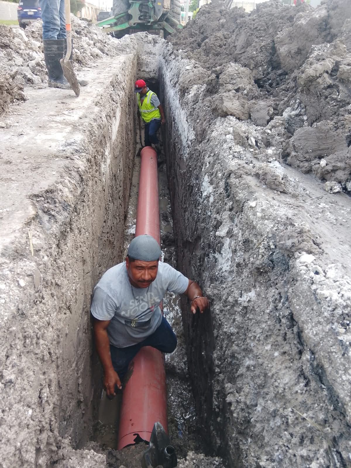 H. Matamoros, Tamaulipas.- El alcalde Beto Granados supervisó los avances de la obra de rehabilitación de la línea sanitaria en la carretera Sendero Nacional, donde se instala tubería de 12 pulgadas para mejorar el servicio y prevenir futuros colapsos.