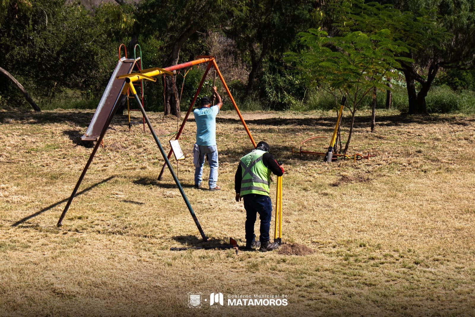 H. Matamoros, Tamaulipas – Con el firme compromiso de seguir transformando Matamoros, el gobierno encabezado por Beto Granados continúa realizando acciones para recuperar y embellecer los espacios públicos que son esenciales para la vida comunitaria. En esta ocasión, la Cuadrilla Renace trabaja en la rehabilitación de las canchas deportivas y el área verde ubicadas en el bordo de la Avenida Tamaulipas.