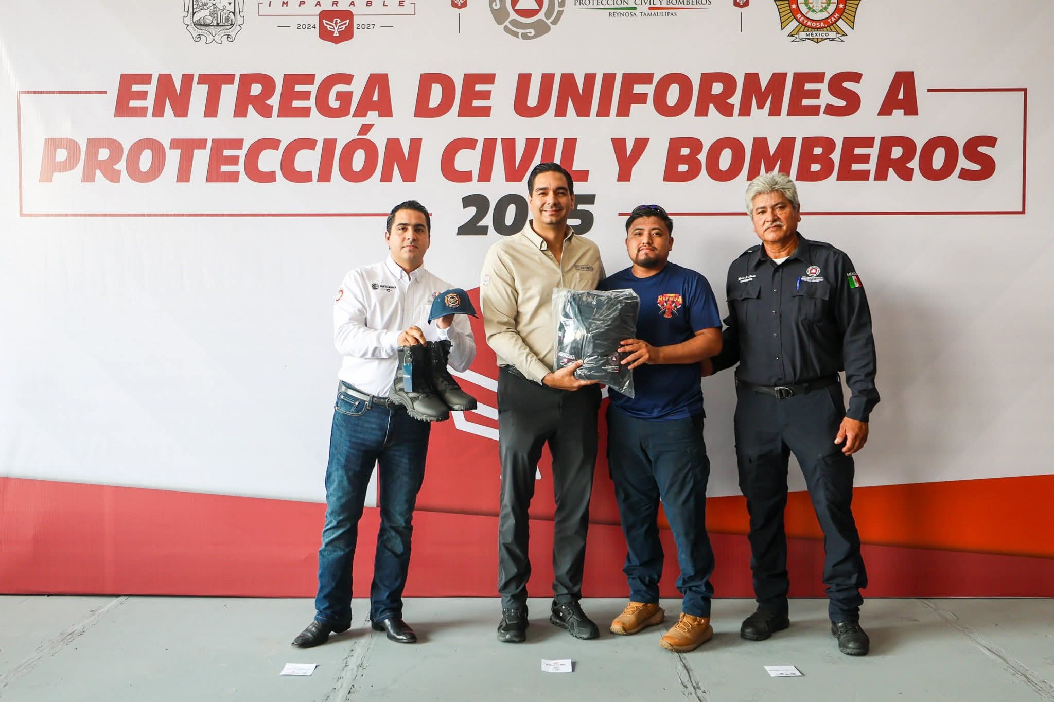 El Presidente Municipal, Carlos Peña Ortiz, encabezó una emotiva ceremonia, con la presencia de Javier Iván Lam Cantú, en la que entregó equipo de protección a los elementos de su corporación, Protección Civil y Bomberos de Reynosa, Los equipos entregados incluyen: