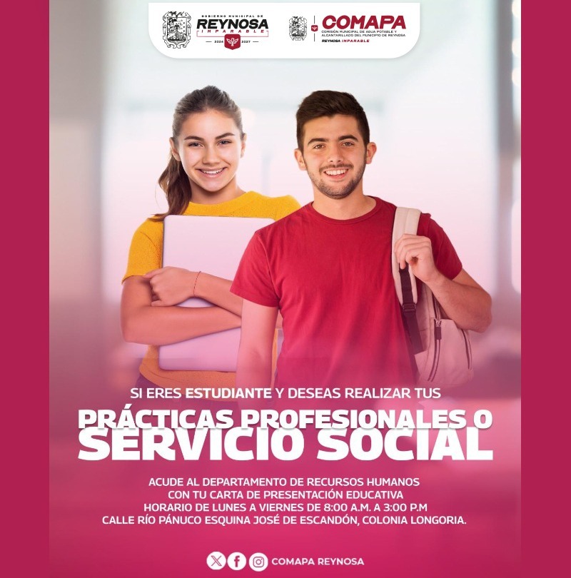 La Comisión Municipal de Agua Potable y Alcantarillado de Reynosa invita a los estudiantes de nivel medio superior y superior a integrarse al organismo para realizar su servicio social o prácticas profesionales, ofreciendo espacios de aprendizaje que contribuyen al desarrollo de sus habilidades y conocimientos.