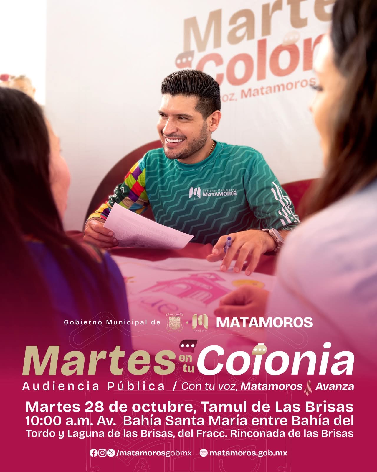 H. Matamoros, Tamaulipas.- Este martes, el programa “Martes en tu Colonia” llegará al Tamul de Las Brisas, donde a partir de las 10:00 de la mañana los vecinos podrán acercarse para compartir sus planteamientos, inquietudes y propuestas directamente con las autoridades municipales.