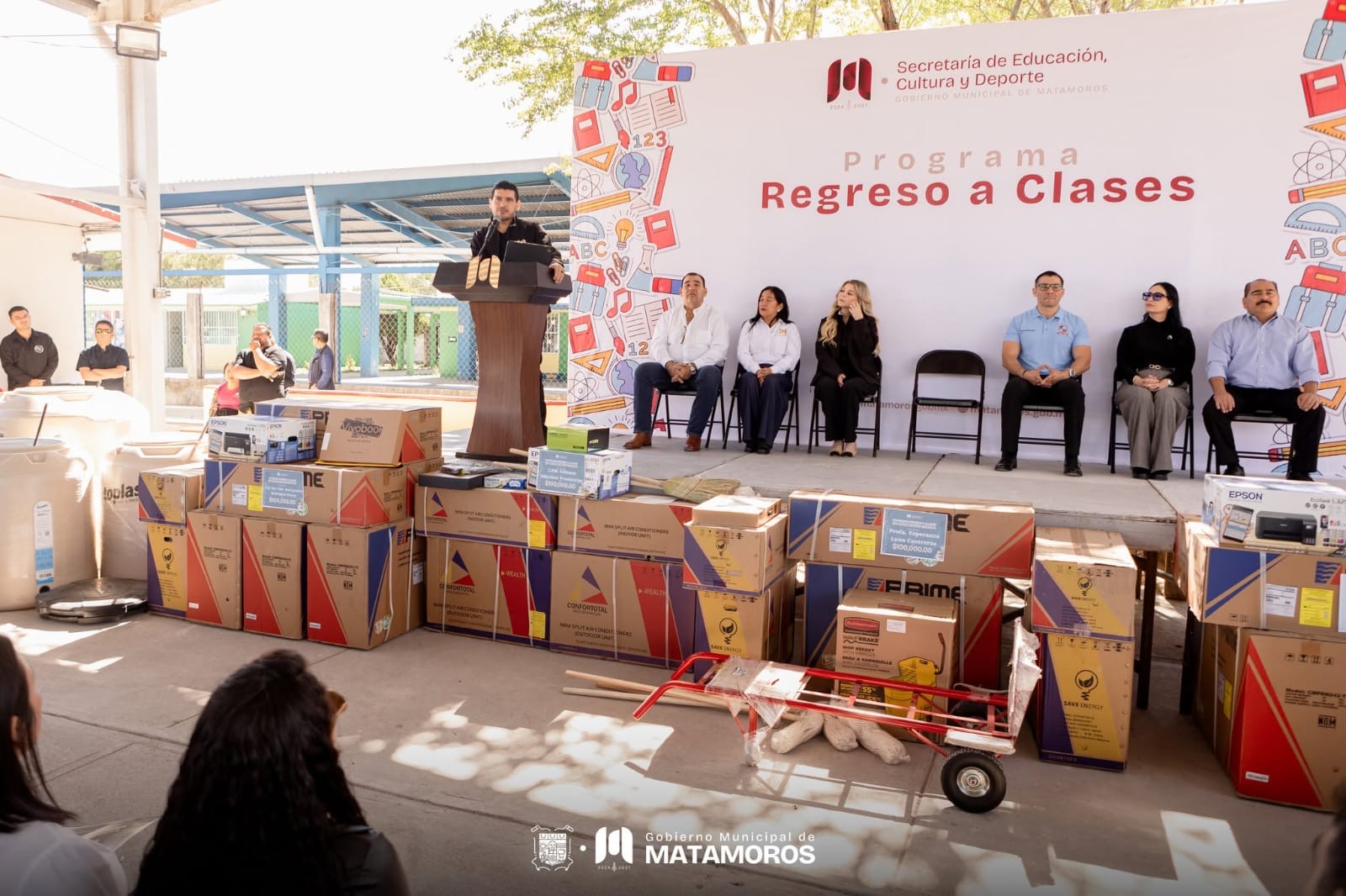 Matamoros, Tamaulipas. — El presidente municipal, Beto Granados, encabezó la segunda entrega de apoyos como parte del programa “Regreso a Clases”, beneficiando a 40 planteles educativos de distintos niveles en el municipio. En esta ocasión, las escuelas recibieron aires acondicionados, material deportivo, pintura e insumos destinados a mejorar la infraestructura y el entorno de aprendizaje de niñas, niños y jóvenes matamorenses.