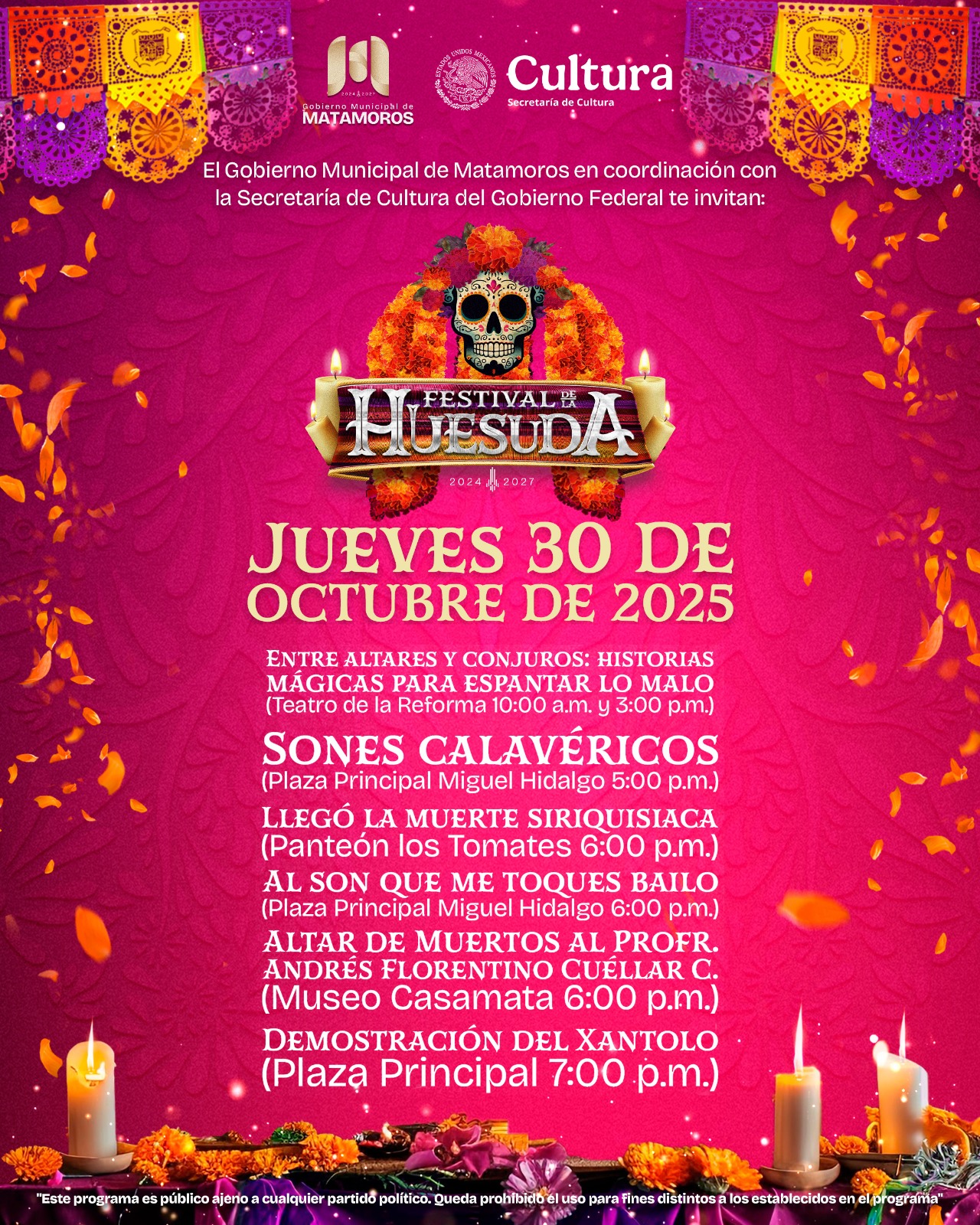 H. Matamoros, Tamaulipas.- El Gobierno Municipal de Matamoros, que encabeza el alcalde Beto Granados, invita a todas las familias a disfrutar este jueves 30 de octubre del Festival de la Huesuda 2025, una jornada llena de arte, música y tradición que celebra la vida y rinde homenaje a nuestras raíces.