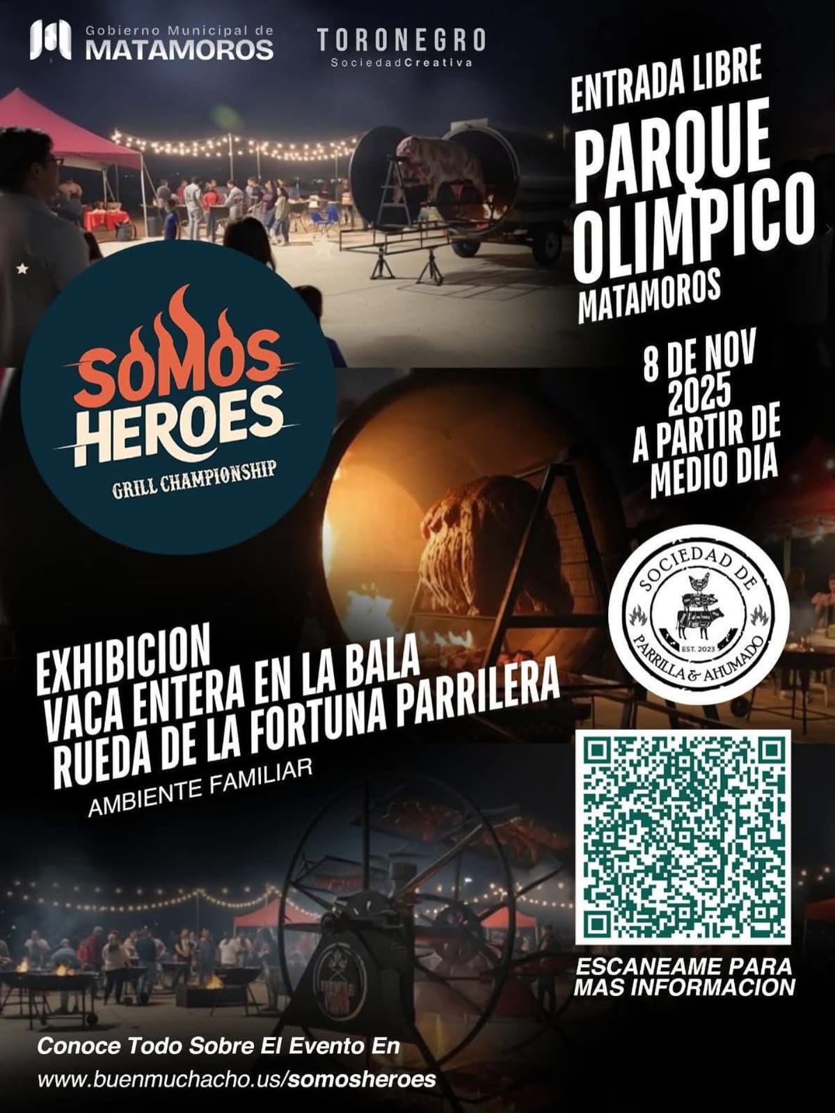 H. Matamoros, Tamaulipas.– El Gobierno de Matamoros, encabezado por Beto Granados, a través de la Secretaría de Turismo, invita a toda la ciudadanía al torneo parrillero “Somos Héroes Grill Championship”, un evento gastronómico y familiar que se llevará a cabo el viernes 8 de noviembre, a partir del mediodía, en el Parque Olímpico, con entrada completamente libre.