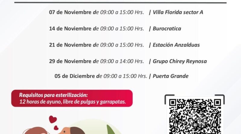 El Presidente Municipal Carlos Peña Ortiz sigue invitando a las familias reynosenses a tener mascotas sanas haciendo uso gratuito de los servicios que lleva a las colonias la brigada médica veterinaria Patitas Seguras, que este viernes 7 de noviembre visitará Villa Florida sector A.