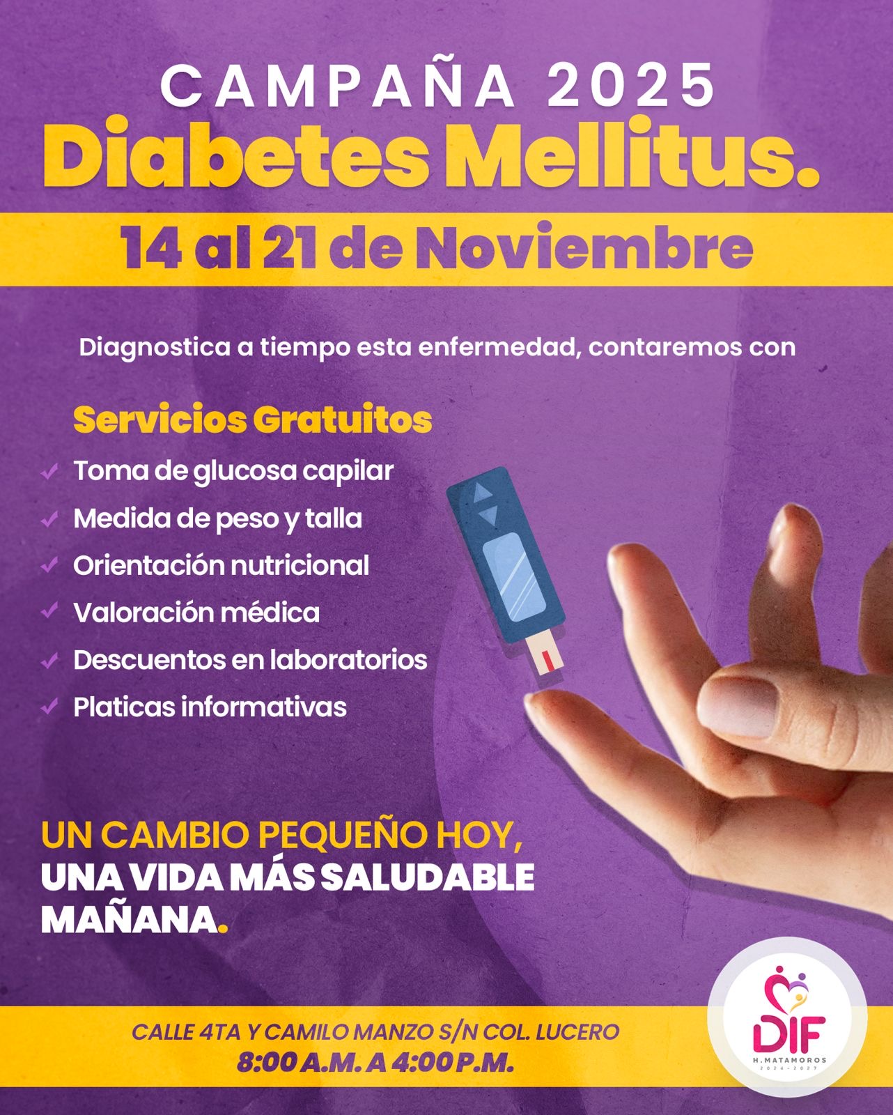 En el marco del Día Mundial de la Diabetes, el Sistema DIF Matamoros que preside la Lic. Ana Ariceaga de Granados, a través del departamento de salud, pone en marcha la campaña de prevención y diagnostico de esta enfermedad crónica, brindando una atención oportuna y promover hábitos saludables entre la población.