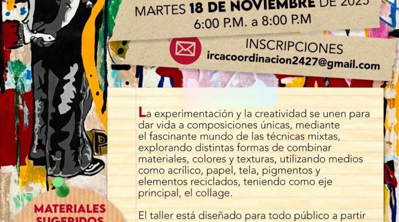 El Taller, dirigido a personas a partir de 15 años, se llevará a cabo el martes 18 de noviembre de 6:00 a 8:00 P. M. en la sede del IRCA Longoria, donde los asistentes podrán experimentar con técnicas mixtas y texturas en un ambiente creativo.