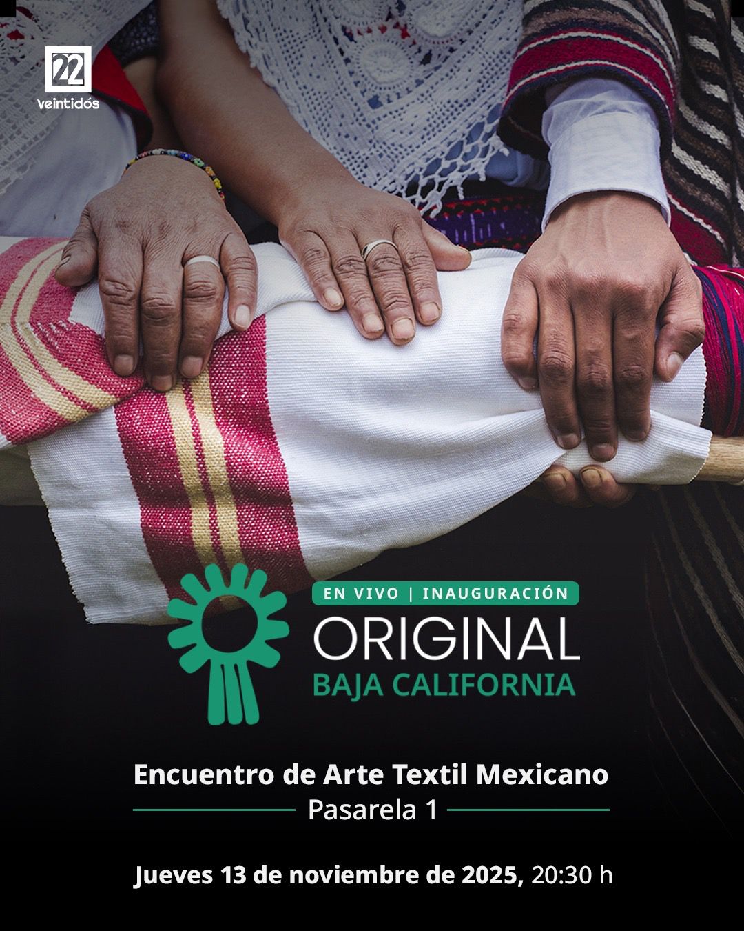 Ciudad de México, a 12 de noviembre de 2025. Canal Veintidós transmitirá, en vivo, la ceremonia de inauguración de ORIGINAL Baja California, donde el Centro Cultural Tijuana (CECUT) albergará el mercado de arte textil tradicional más grande de América Latina. En este encuentro se reunirán maestras y maestros artesanos para compartir su talento en arte textil, joyería, accesorios y arte decorativo y utilitario a través de técnicas ancestrales, como el tejido en telar de cintura o el teñido con caracol púrpura, al igual que otros trabajos de enorme valor artístico de ramas artesanales como madera, alfarería y cerámica, arte wixárika, talabartería y peletería, fibras vegetales y orfebrería.