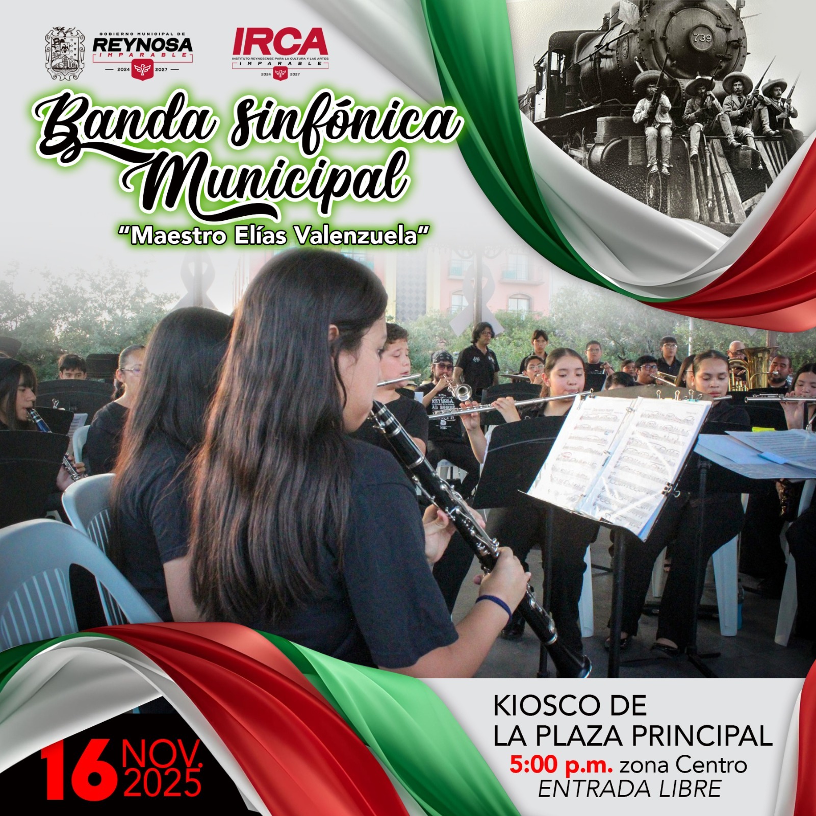 A las 5:00 P. M., en el kiosco de la plaza principal Miguel Hidalgo en la zona Centro, se presentará la Banda Sinfónica Municipal «Maestro Elías Valenzuela», bajo la dirección del Maestro Enrique Martínez Ruiz.