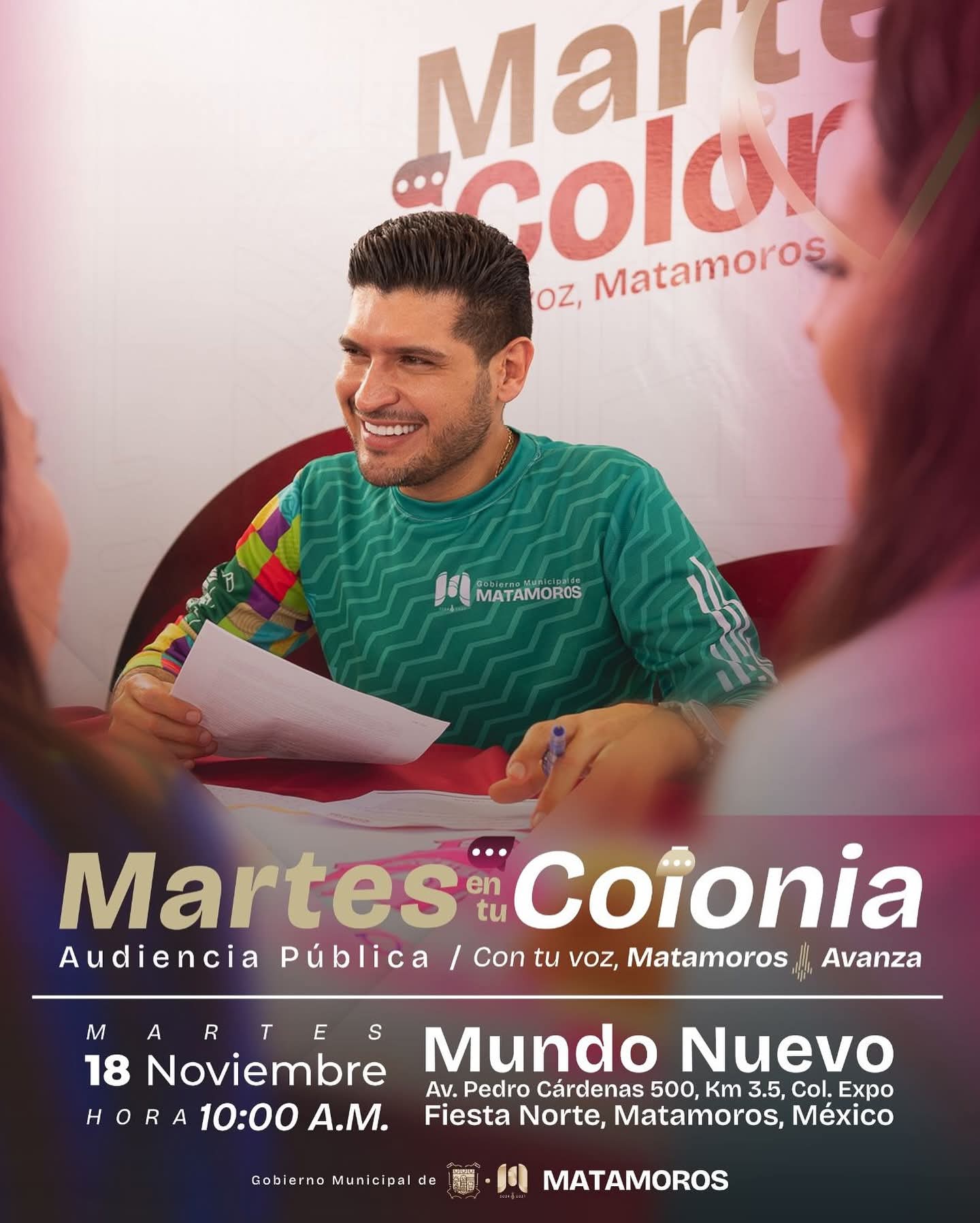 H. Matamoros, Tamaulipas.- El alcalde Beto Granados encabezará este martes 18 de noviembre una nueva jornada del programa «martes en tu colonia’, que se llevará a cabo en las instalaciones del Centro de Convenciones Mundo Nuevo a partir de las 10:00 de la mañana, con el propósito de acercar los principales servicios municipales a las familias matamorenses.