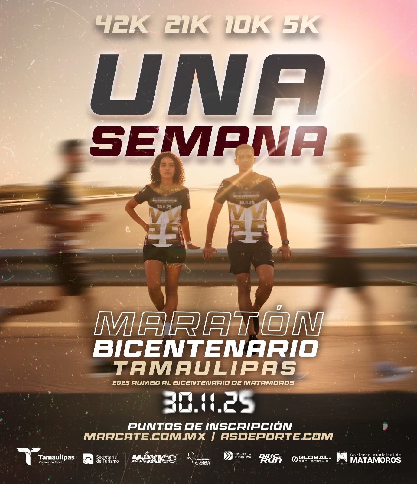 H. Matamoros, Tamaulipas.- El Gobierno de Beto Granados anunció el arranque oficial de la cuenta regresiva rumbo al Maratón Bicentenario Tamaulipas 2025, un evento deportivo que celebrará con orgullo el camino hacia el Bicentenario de Matamoros. A solo una semana de la gran fiesta atlética, el ambiente de entusiasmo y preparación se hace presente entre corredores locales y visitantes.