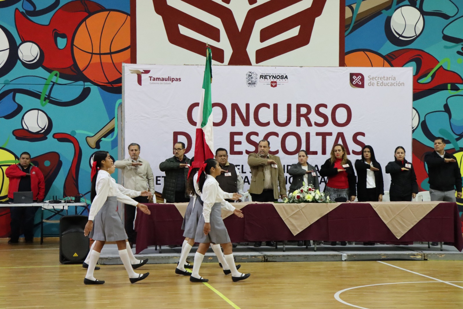 El Alcalde Carlos Peña Ortiz fortalece la formación cívica de las y los jóvenes reynosenses, al brindar su respaldo para la realización del Concurso de Escoltas Etapa Municipal correspondiente a los niveles Secundaria y Telesecundarias, evento que tuvo como sede el Polideportivo.
