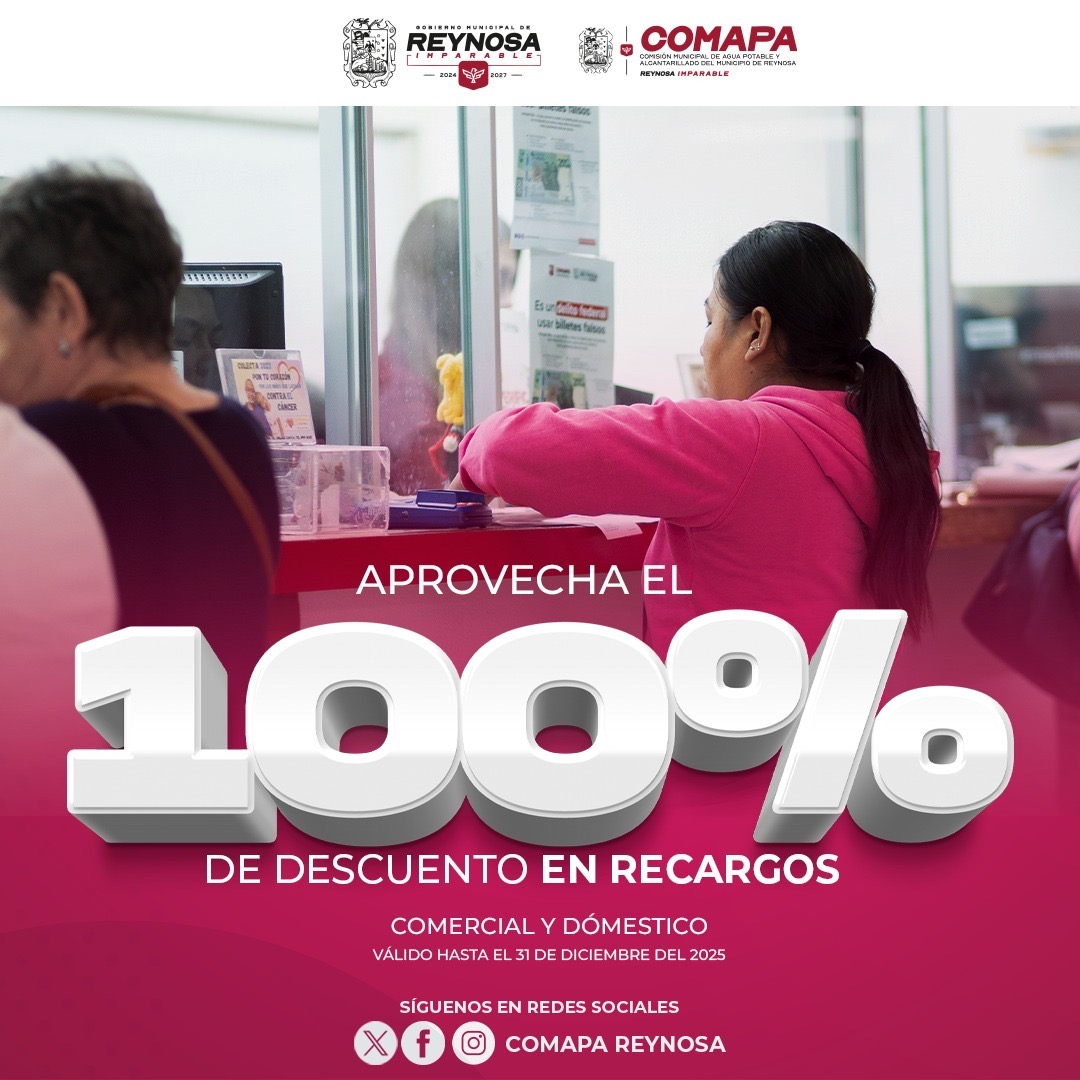 La Comisión Municipal de Agua Potable y Alcantarillado de Reynosa invita a las y los usuarios a aprovechar los últimos días del beneficio del 100% de descuento en recargos por adeudo en los servicios doméstico y comercial, vigente hasta el 31 de diciembre de 2025.