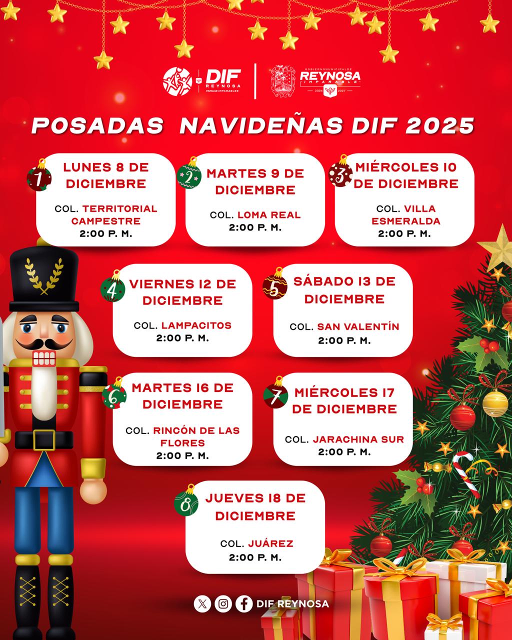 Por instrucciones del Alcalde Carlos Peña Ortiz, a través del Sistema DIF-Reynosa que preside Carlos Luis Peña Garza, se realizarán Posadas Navideñas 2025 en diversas colonias de la ciudad, con el propósito de llevar convivencia, unión y momentos de recreación a niñas, niños y familias.