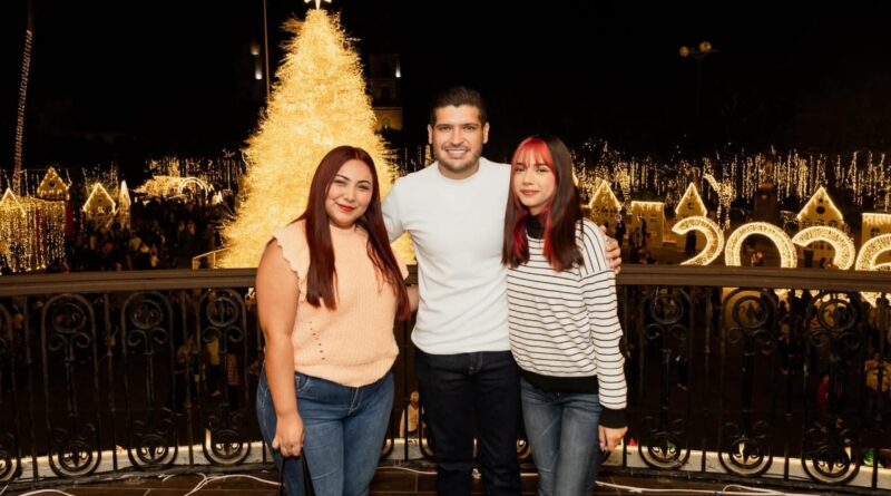 H. Matamoros, Tamaulipas.- Con la presencia del alcalde Beto Granados, residentes de Matamoros tuvieron la oportunidad de subir al balcón de la Presidencia Municipal para tomarse su foto en familia, con el pino iluminado y la Plaza Principal como el marco perfecto que hace brillar a Matamoros.
