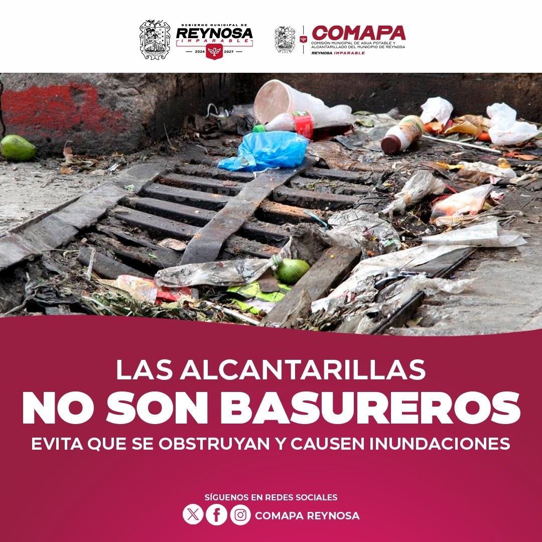La Comisión Municipal de Agua Potable y Alcantarillado de Reynosa hace un atento exhorto a la ciudadanía a no arrojar basura, grasa ni desechos sólidos en la vía pública ni en las alcantarillas, ya que estas malas prácticas provocan obstrucciones en las redes pluviales y sanitarias, lo que puede derivar en encharcamientos e inundaciones.