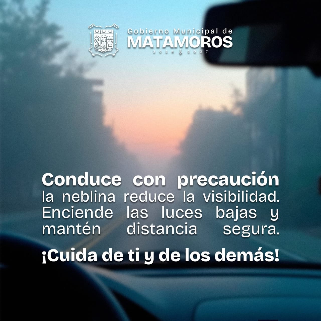 H. Matamoros, Tamaulipas.- Ante la presencia de neblina en distintos puntos de la ciudad, el Gobierno Municipal de Matamoros, encabezado por el alcalde Beto Granados, exhorta a la ciudadanía a extremar precauciones al conducir, ya que estas condiciones reducen considerablemente la visibilidad.