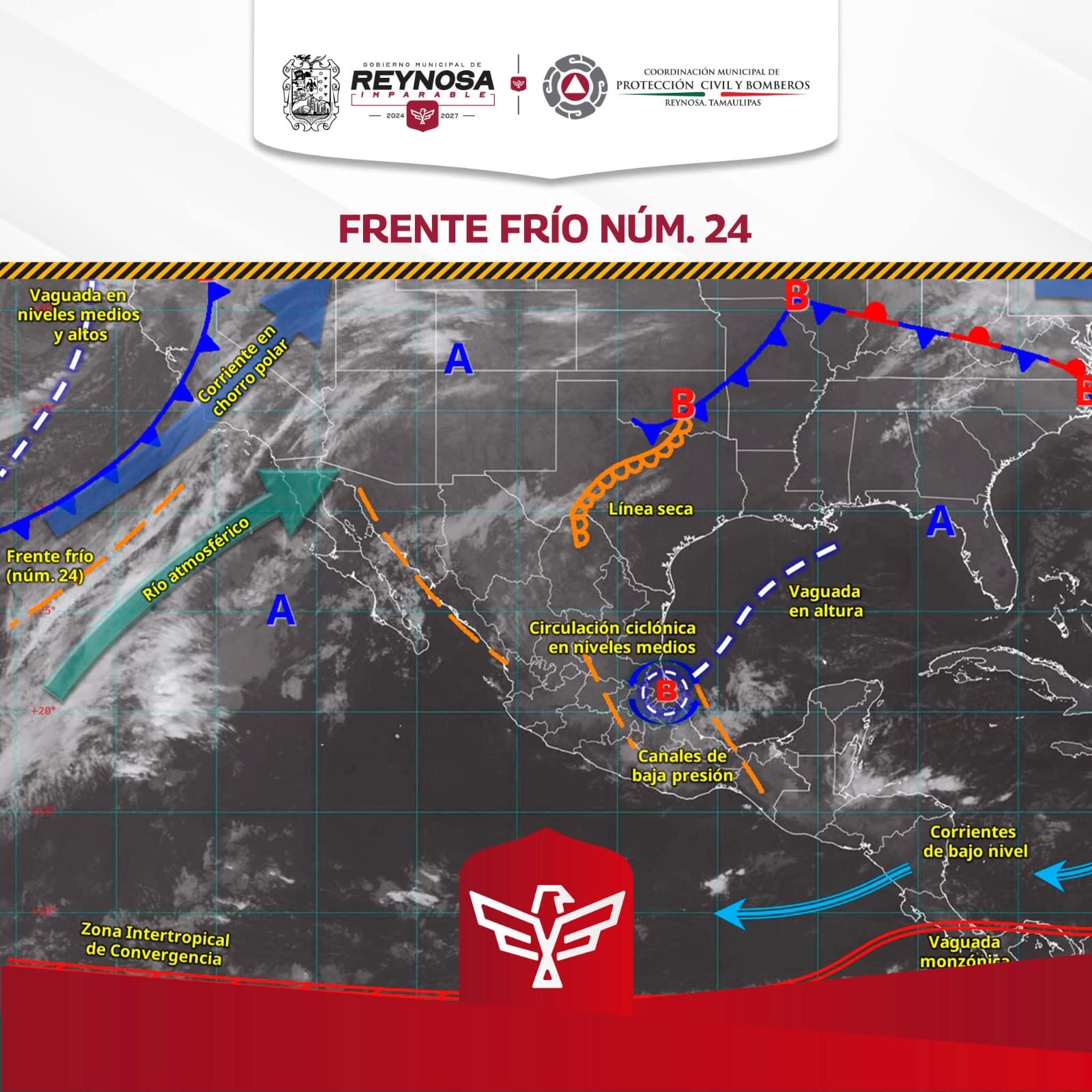 Si La Coordinación de Protección Civil y Bomberos del Gobierno de Reynosa le da a conocer que, el Frente Frío Número 24, que arribó a esta frontera el día sábado 27 de diciembre, provocará un descenso en la temperatura hoy domingo 28, 11° Centígrados y más de 20% de probabilidad de lluvia.