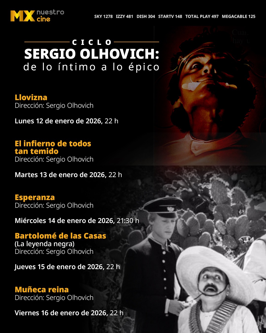MX Nuestro Cine invita al público a sintonizar la señal 22.2 para este recorrido por la filmografía de Sergio Olhovich, cuya obra refleja un periodo de transformación en la producción y los temas del cine mexicano.