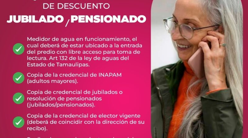 La Comisión Municipal de Agua Potable y Alcantarillado de Reynosa invita a los usuarios adultos mayores, jubilados y pensionados a realizar la actualización de sus datos en el padrón del descuento FAS, con el objetivo de continuar recibiendo el 50 por ciento de descuento en los primeros 20 metros cúbicos de consumo de agua potable.