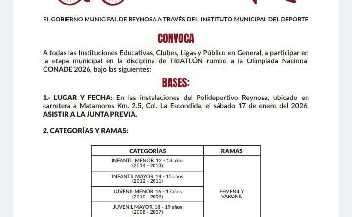 El Alcalde Carlos Peña Ortiz invita a los deportistas de Reynosa a participar en la Olimpiada Municipal del Deporte, un evento que busca detectar y fortalecer el talento deportivo local.