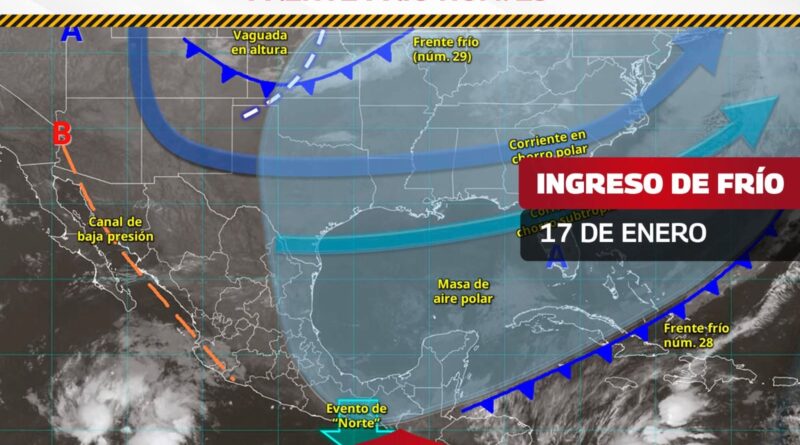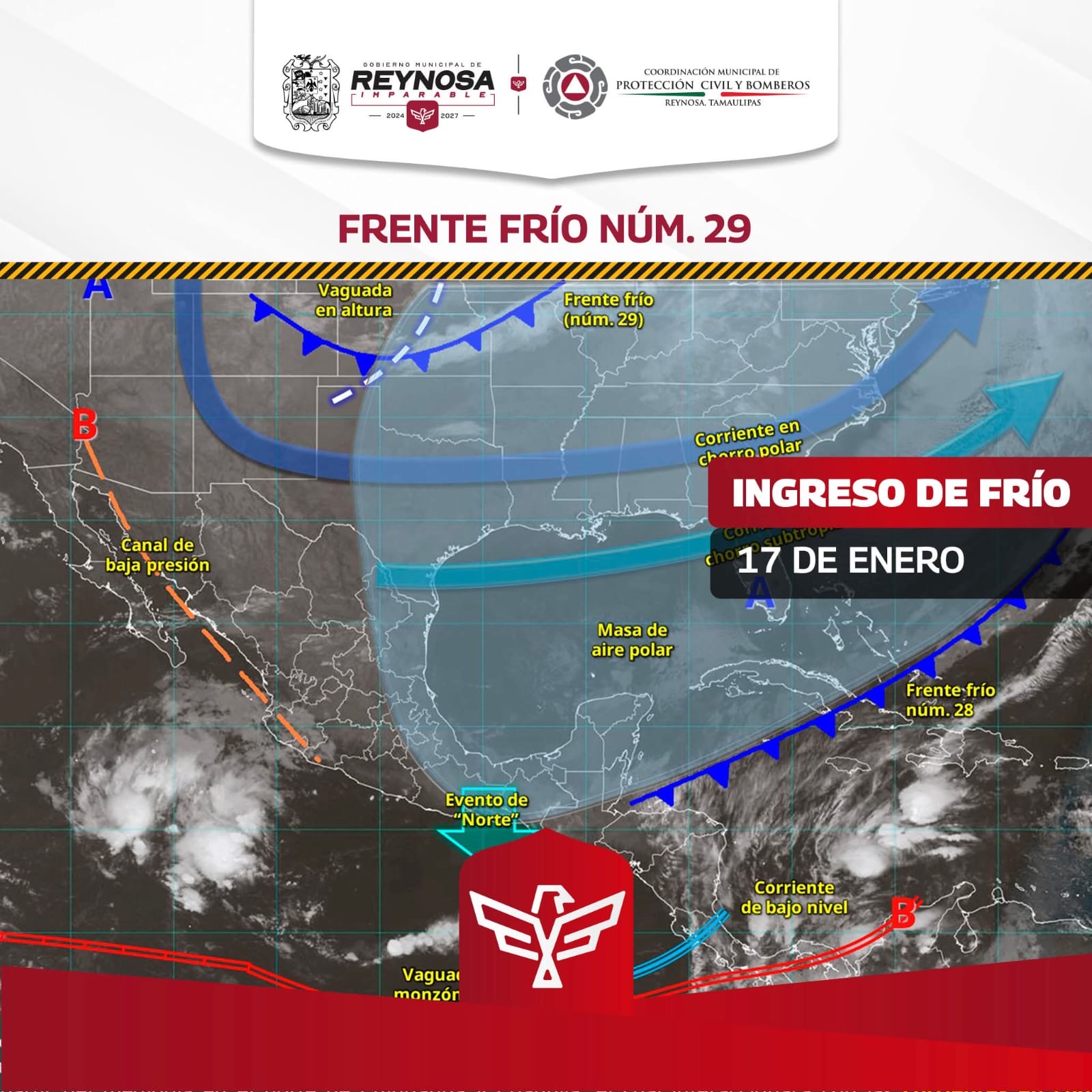 El Gobierno Municipal de Reynosa informa que como efecto del Frente Frío Número 29, este sábado 17 de enero se podría registrar el descenso de la temperatura hasta entre 6° y 7° Centígrados, considerando que la máxima se situaría en 18°, con alta probabilidad de lluvia, de acuerdo a datos del Servicio Meteorológico Nacional.