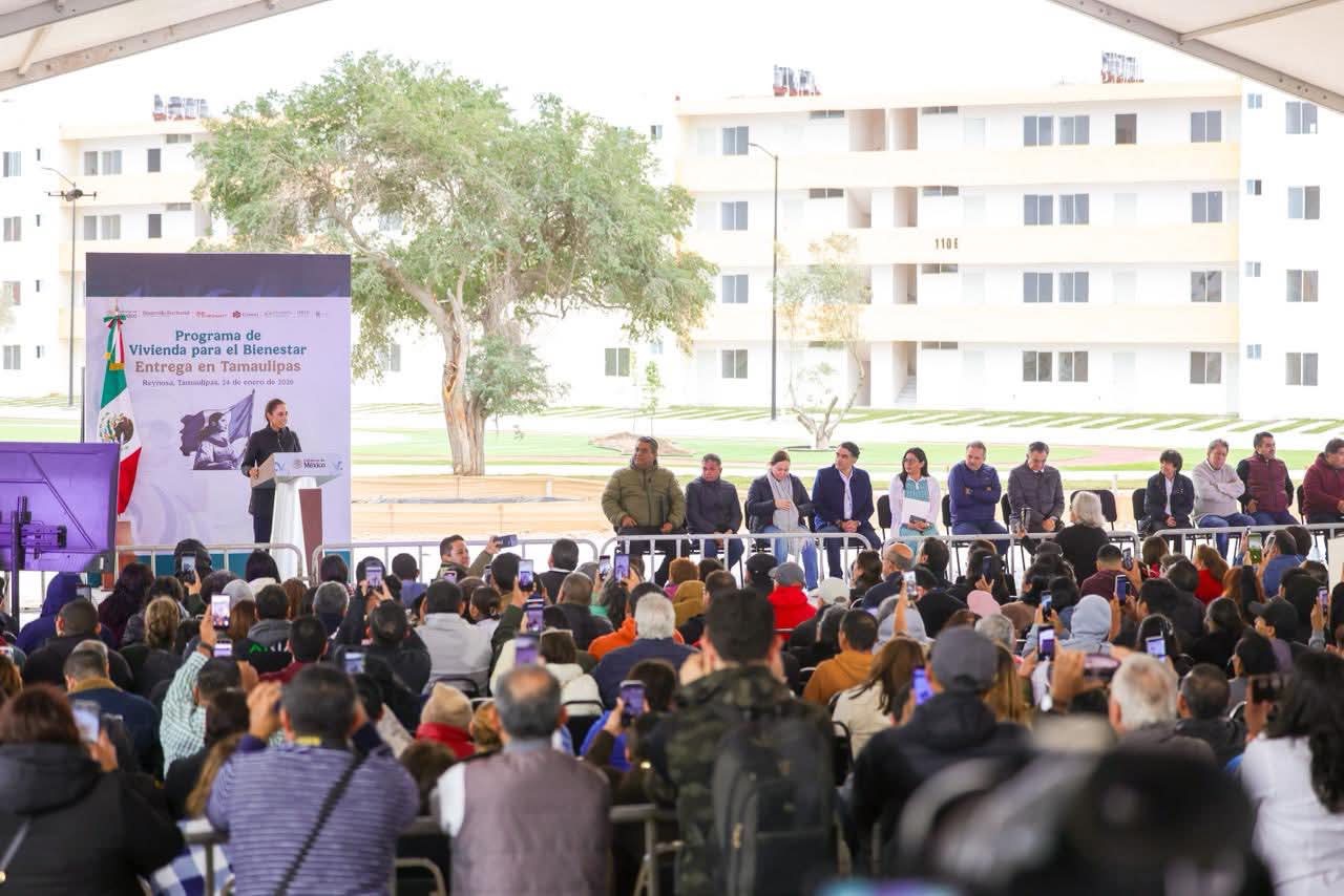 «Me da mucho gusto estar hoy aquí en Reynosa, Tamaulipas, para entregar beneficios de los programas del Gobierno de la República. Agradezco la presencia del Gobernador Constitucional de Tamaulipas, Doctor Américo Villarreal Anaya, y del Presidente Municipal de Reynosa, Carlos Peña Ortiz», dijo la Presidenta al encabezar la entrega de beneficios de programas federales, de Vivienda del Bienestar y Pensión para Mujeres Bienestar.