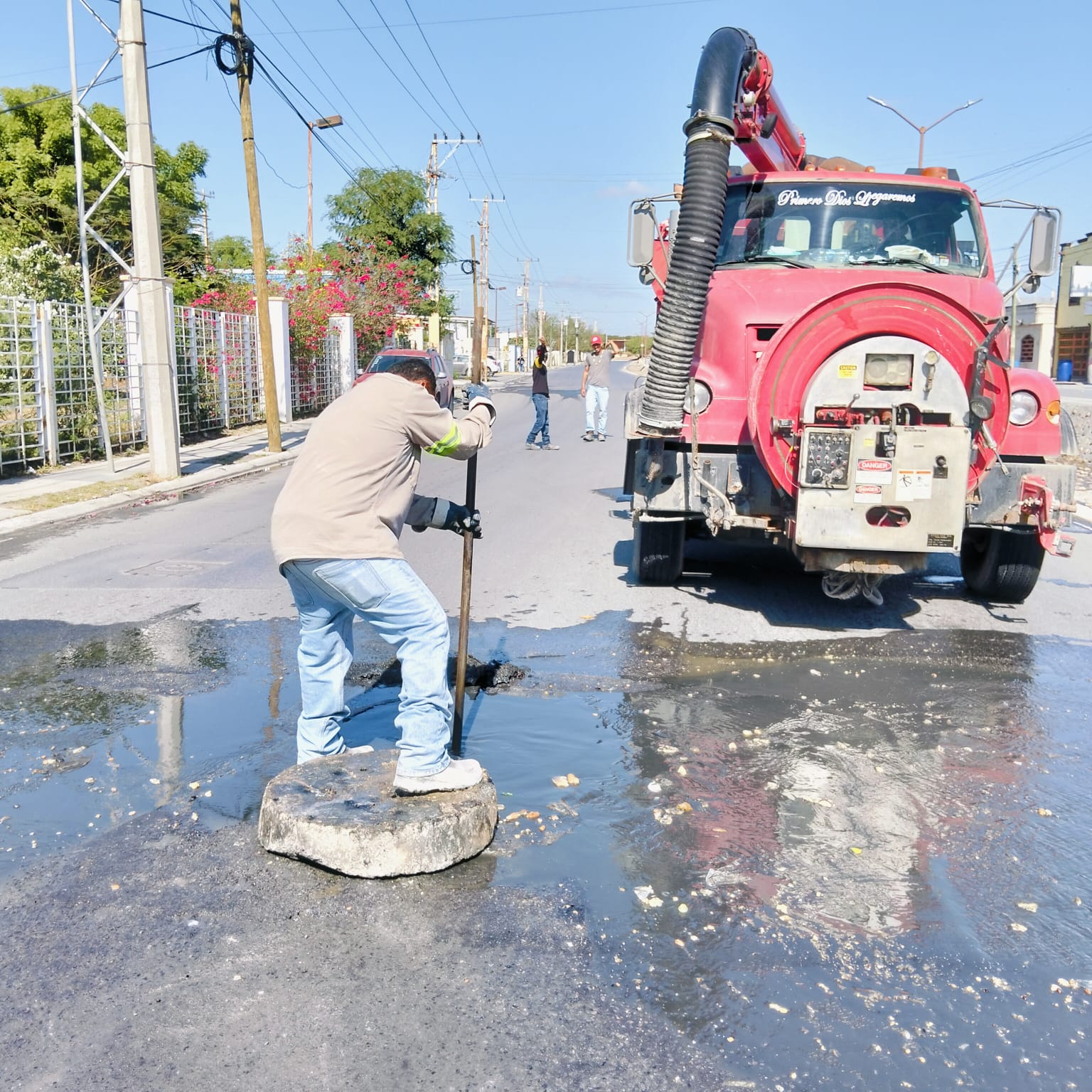 La Comisión Municipal de Agua Potable y Alcantarillado de Reynosa llevó a cabo trabajos de limpieza de pozos de visita sobre la avenida Bugambilias y Hacienda Querétaro, en el fraccionamiento Hacienda Las Bugambilias, con el objetivo de mantener bajos los niveles de la línea general y prevenir derrames en el sector.