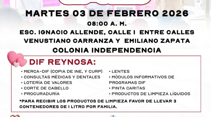El Sistema DIF-Reynosa que encabeza Carlos Luis Peña Garza, realizará la Brigada»DIF en Tu Colonia», el martes 03 de febrero, a partir de las 08:00 de la mañana, en la Escuela «Ignacio Allende», ubicada en la calle I, entre Venustiano Carranza y Emiliano Zapata, en la colonia Independencia, con el objetivo de acercar servicios y apoyos a las familias del sector.