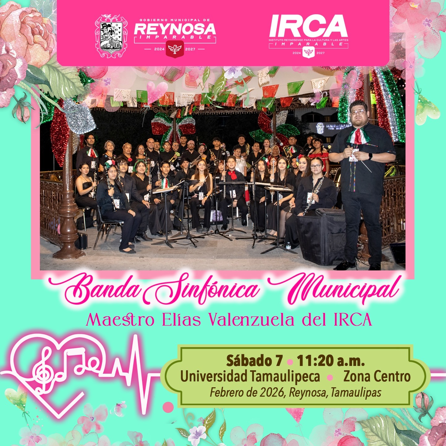 El Gobierno de Reynosa, que preside el Alcalde Carlos Peña Ortiz, invita a la ciudadanía a la presentación de la Banda Sinfónica Municipal «Maestro Elías Valenzuela» del Instituto Reynosense para la Cultura y las Artes.