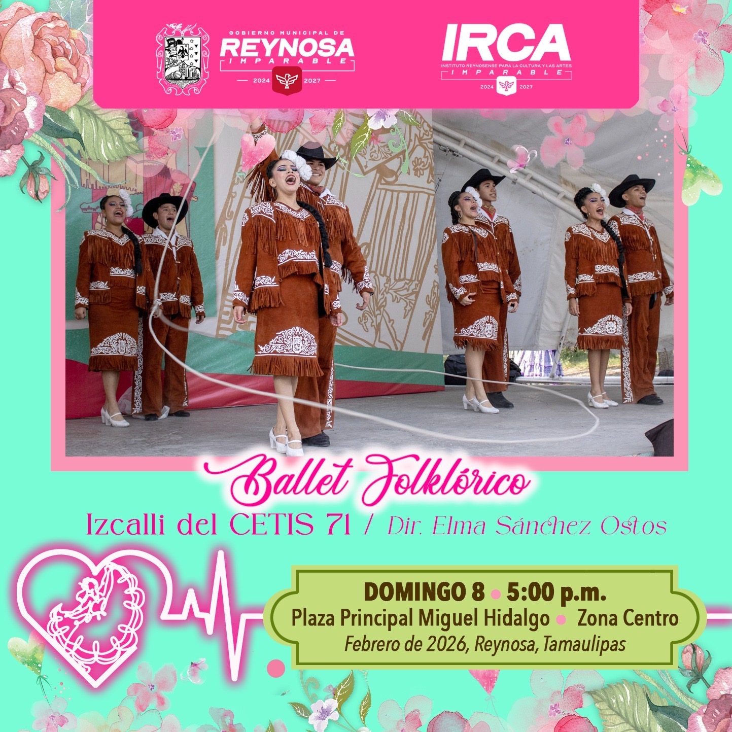 El Gobierno de Reynosa, que preside el Alcalde Carlos Peña Ortiz, convoca a las familias de la ciudad a disfrutar de la presentación del Ballet Folklórico «Izcalli» del Centro de Estudios Tecnológicos, Industrial y de Servicios No. 71, bajo la dirección de la Maestra Elma Sánchez Ostos.