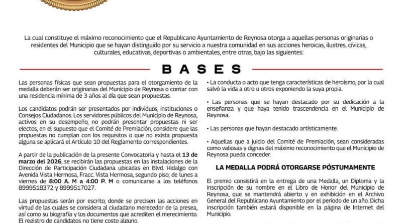 El Alcalde Carlos Peña Ortiz hace una invitación a la sociedad reynosense a la Convocatoria Medalla al Mérito Ciudadano «Ing. Marte R. Gómez» 2026, dirigida a aquellas personas originarias o residentes del Municipio que se hayan distinguido por su servicio a nuestra comunidad en sus acciones heroicas, ilustres, cívicas, culturales, educativas, deportivas o ambientales.