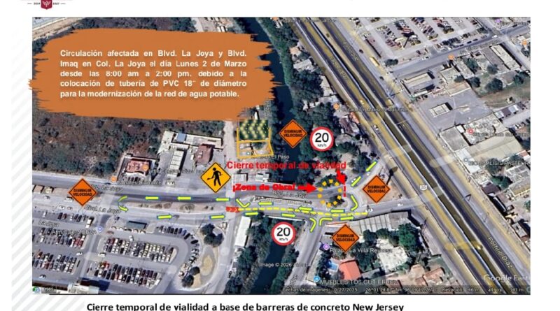 La Comisión Municipal de Agua Potable y Alcantarillado de Reynosa informa a la ciudadanía que, como parte de los trabajos de modernización de la red de agua potable, este lunes 2 de marzo permanecerá cerrado a la circulación el tramo del bulevar La Joya y bulevar IMAQ, en la colonia La Joya.