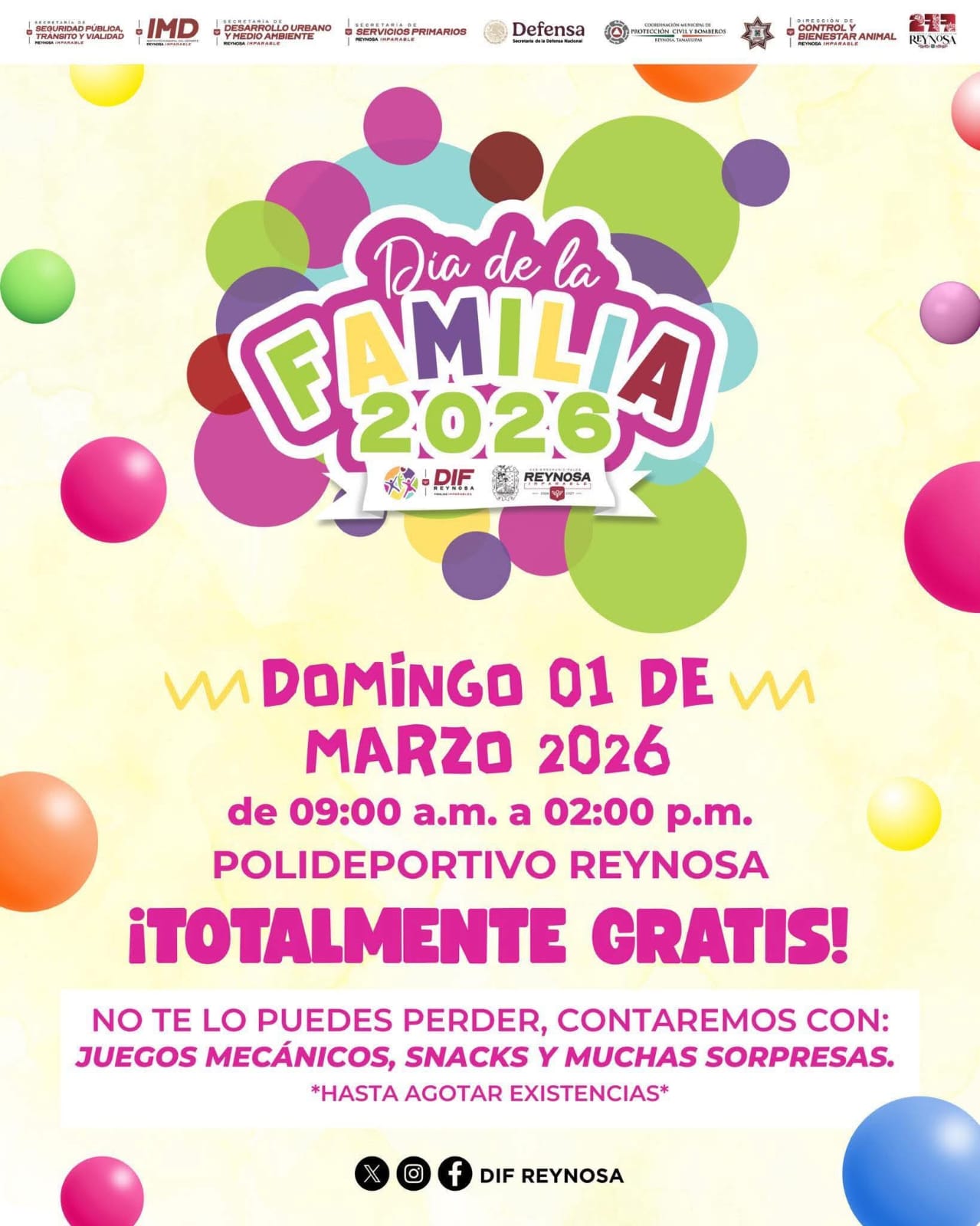 El Polideportivo Reynosa es el recinto donde se celebra el Día de la Familia, aún puede acudir hasta las 2:00 P. M. para disfrutar de la exhibición de vehículos de la SEDENA, Protección Civil y la participación de la Policía Vial, pinta caritas, peinados locos, snacks y muchas sorpresas para chicos y grandes.