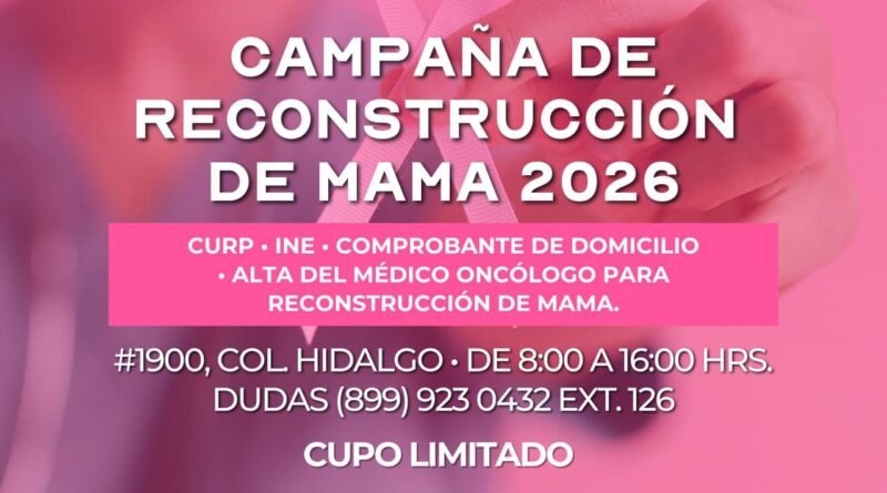 El Sistema DIF-Reynosa que preside Carlos Luis Peña Garza, mantiene abierta la Campaña de Reconstrucción de Mama 2026, con el objetivo de contribuir al bienestar integral, mejorar la autoestima, seguridad y calidad de vida de las mujeres.