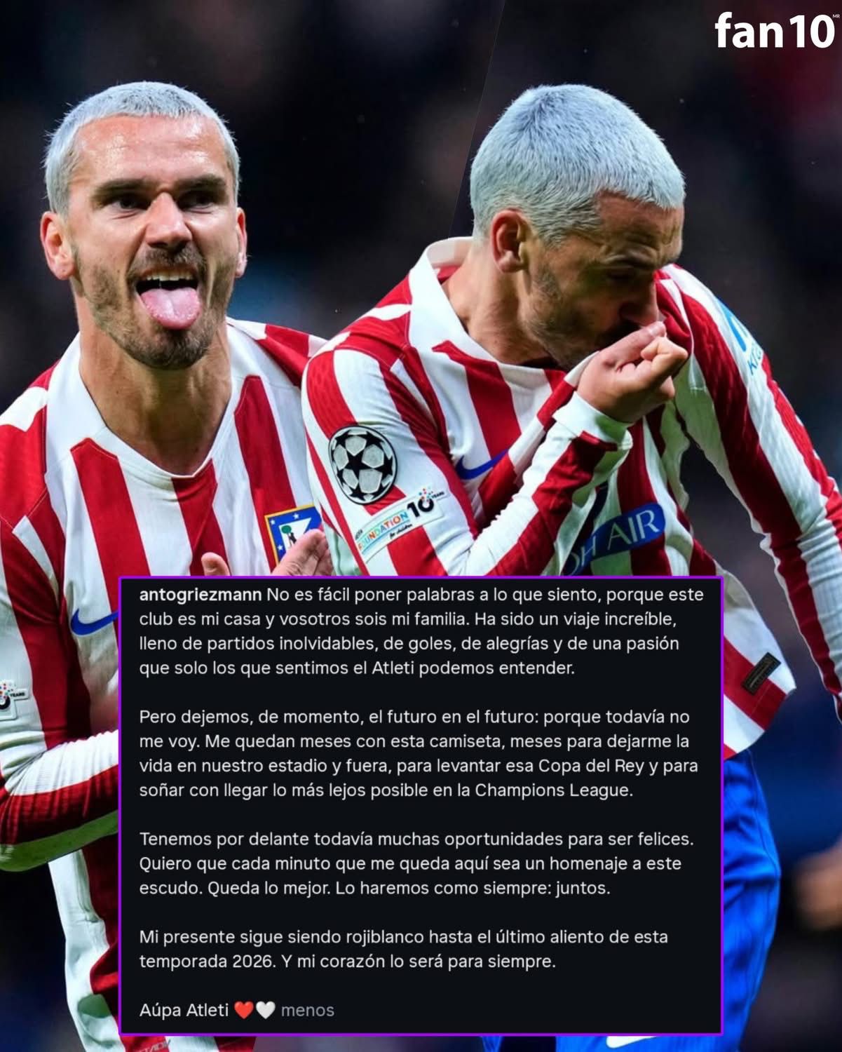 A pesar de su salida, Griezmann aseguró que su corazón seguirá siendo rojiblanco para siempre. «Mi presente sigue siendo rojiblanco hasta el último aliento de esta temporada 2026. Y mi corazón lo será para siempre», concluyó