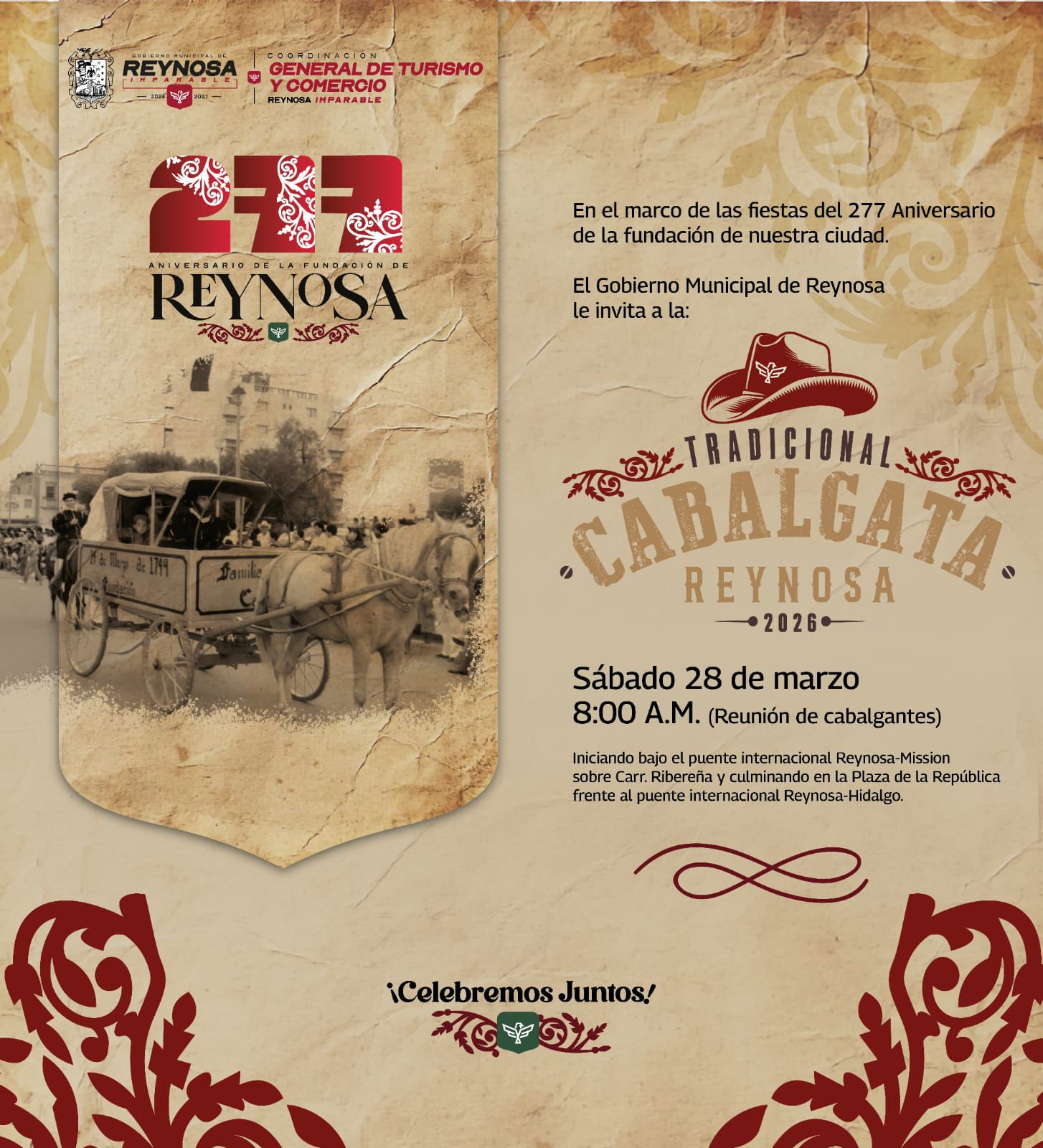 La Cabalgata 2026 del 277 Aniversario de la Fundación de Reynosa será encabezada por el Presidente Municipal Carlos Peña Ortiz el próximo sábado a las 8:00 de la mañana, recreando parte del histórico recorrido que en el año 1802 hicieron los pobladores de la Villa de Nuestra Señora de Guadalupe de Reynosa para establecerse en las Lomas de San Antonio, actual ubicación de la ciudad.