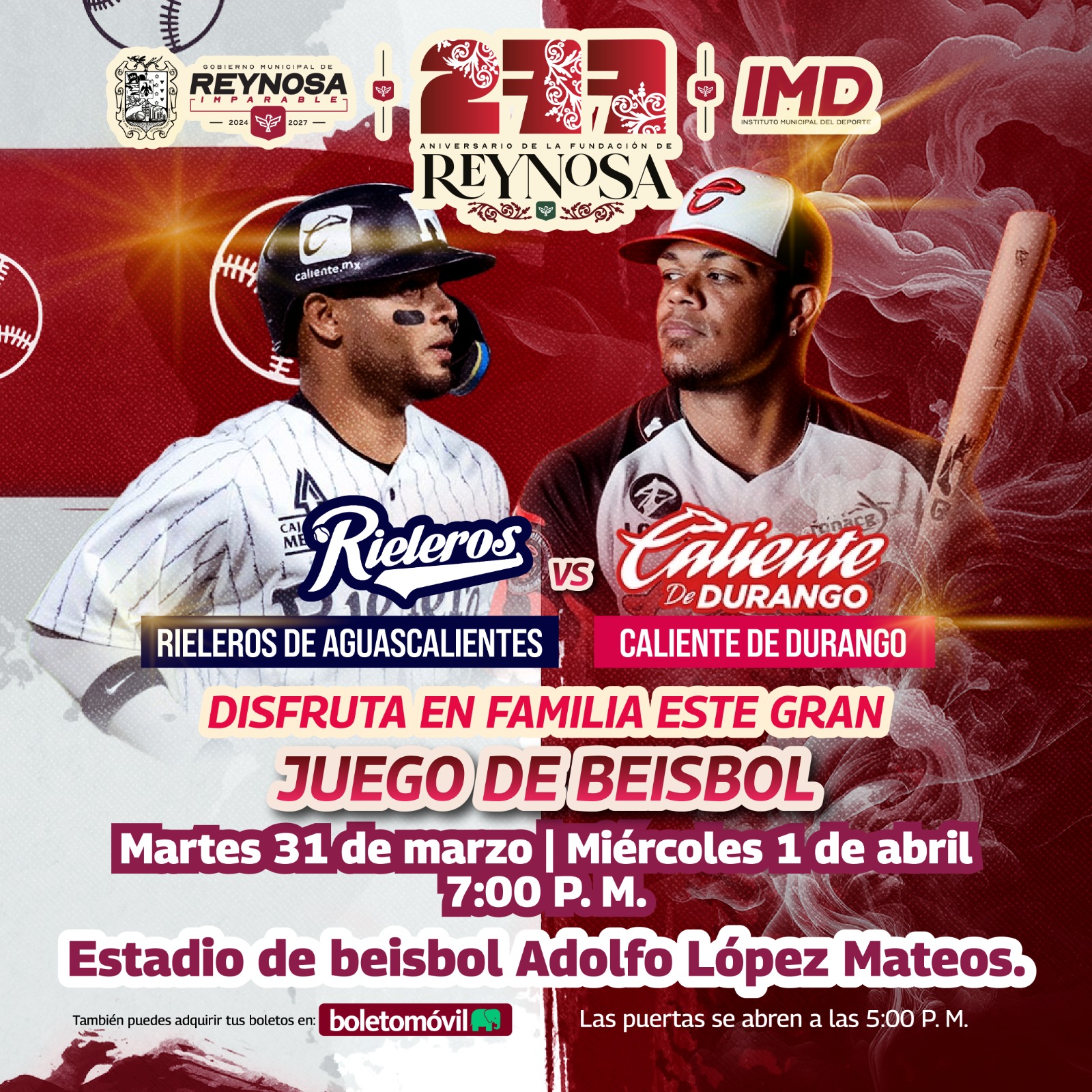 Hoy miércoles 1 de abril el parque Adolfo Lopez Mateos es el escenario del Beisbol Profesional «AAA» en Reynosa y el Alcalde Carlos Peña Ortiz te invita a disfrutar un encuentro entre los peloteros del Club Rieleros de Aguascalientes y los Lobos del Club Caliente de Durango a las 7:00 de la noche con el excelente clima de la temporada.