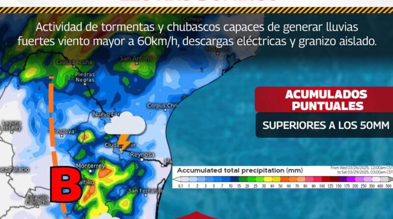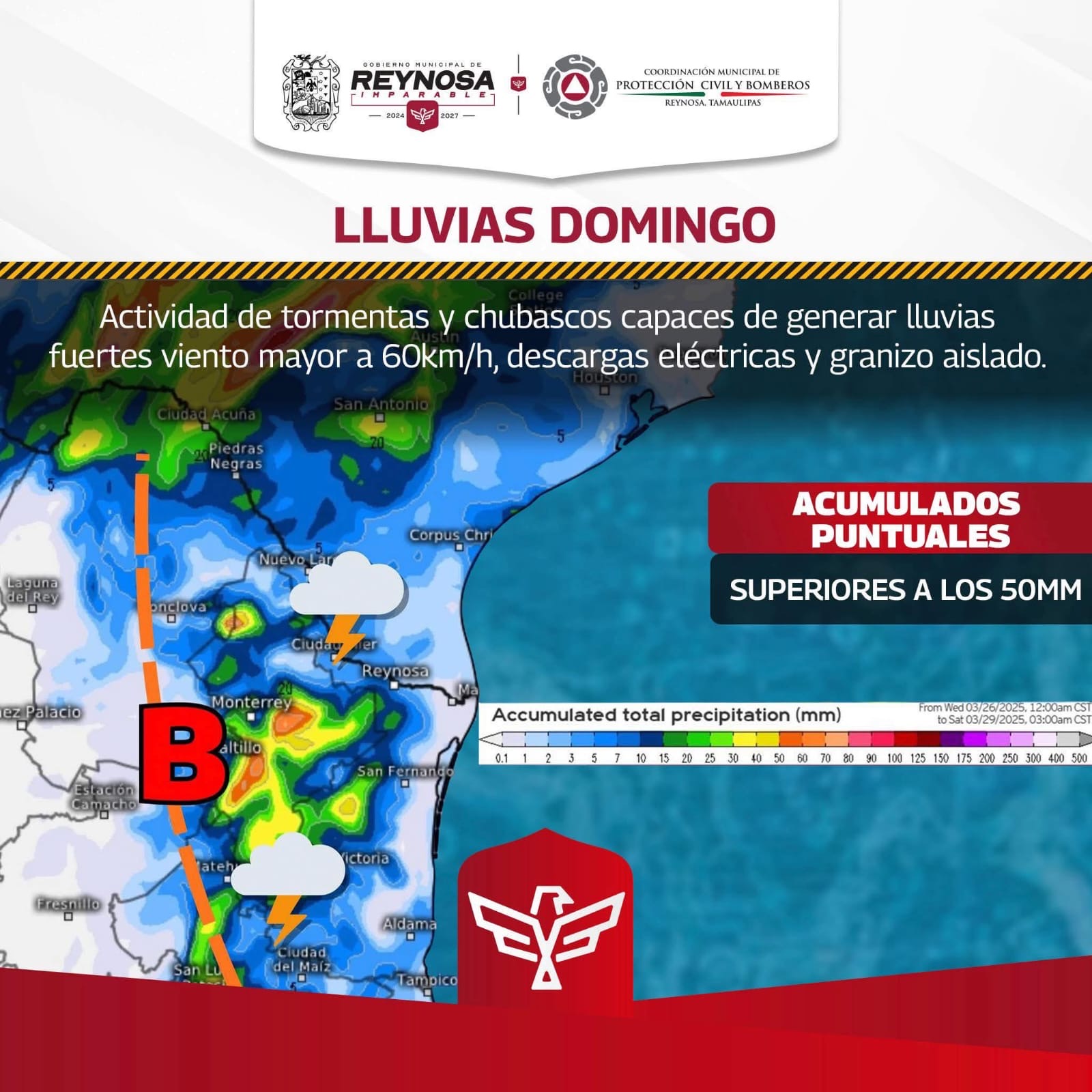 La Coordinación de Protección Civil y Bomberos del Gobierno Municipal de Reynosa, anuncia que durante las próximas horas se prevé el desarrollo de tormentas en la ciudad, con rachas de viento, actividad eléctrica y posibilidad de caída de granizo.